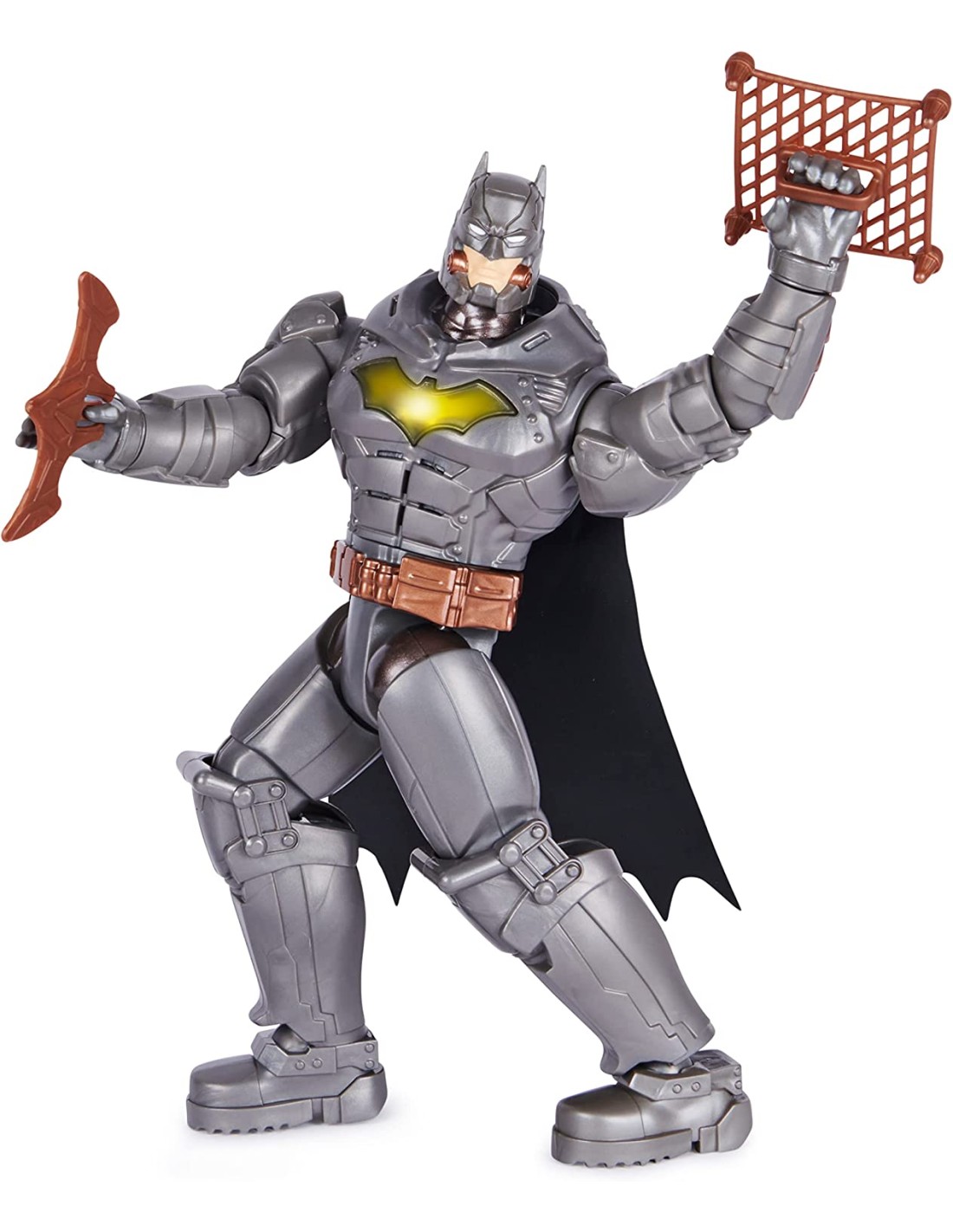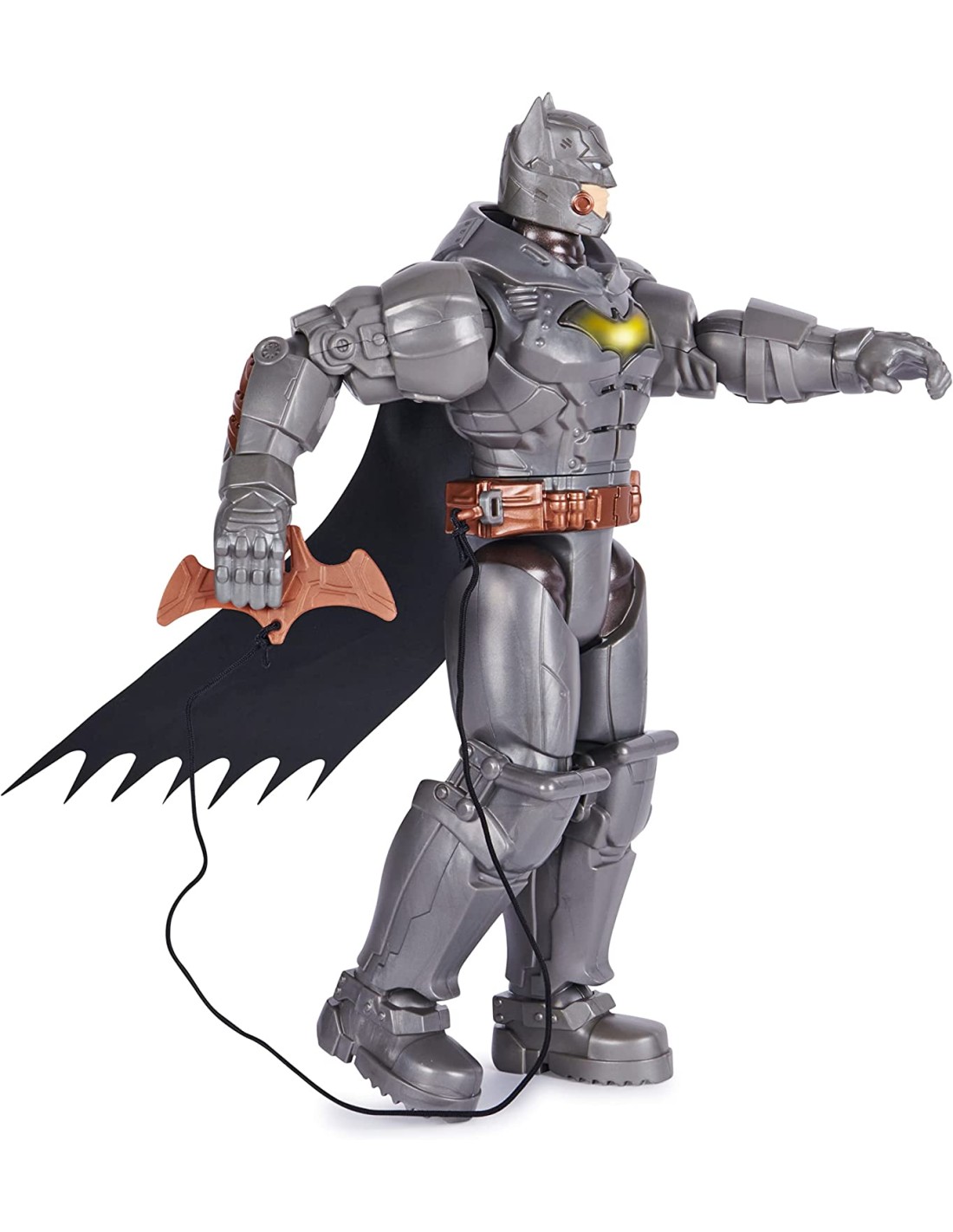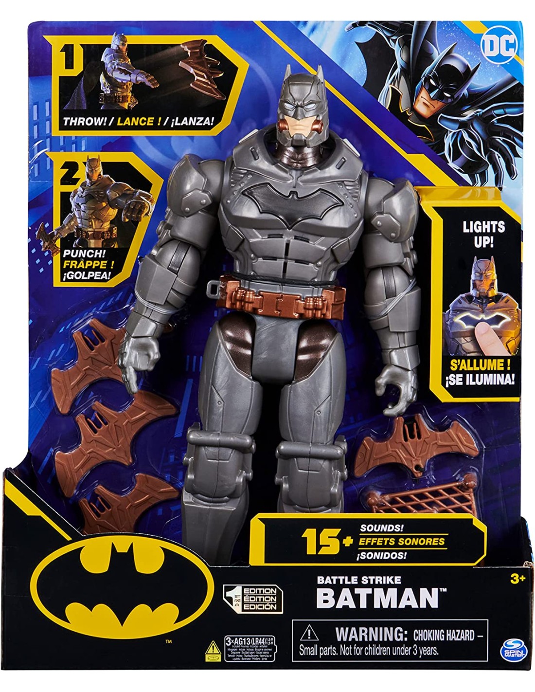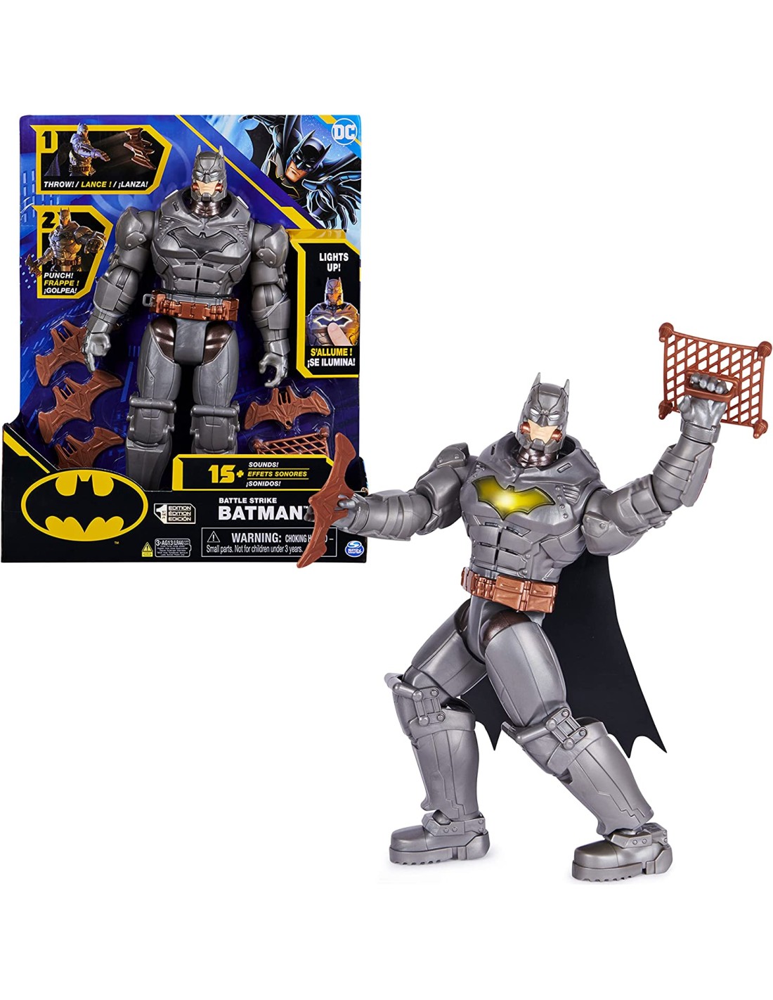BATTLE STRIKE BATMAN: il personaggio di Battle Strike Batman da 30 cm è dotato di un'armatura completa. Posiziona i batarang, la rete o il rampino sulle mani di Batman e tira indietro le gambe per lanciarli contro i supercriminali. OLTRE 20 SUONI: premi il petto di Batman per attivare oltre 20 suoni diversi. ARMATURA E 5 ACCESSORI: con batarang, rete e rampino, Batman potrà affrontare tutti i suoi nemici. Crea le tue avventure di Batman. DESIGN FEDELE AL FUMETTO: questo personaggio di Batman è rappresentato nei minimi dettagli, con armatura completa, mantello in tessuto e un design ispirato al fumetto che dà vita ai tuoi giocattoli di Batman preferiti. Include: 1 personaggio, 5 accessori