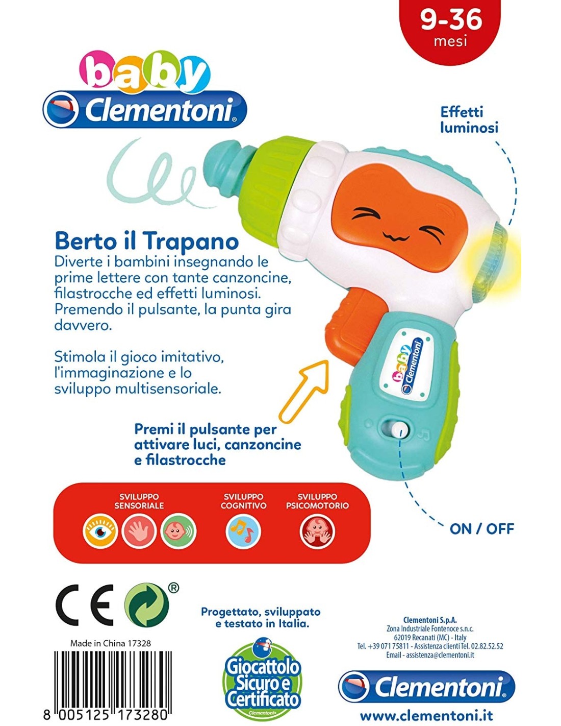 Clementoni - 17328 - Berto Il Trapano - Gioco Prima Infanzia - Giocattolo Elettronico Parlante Italiano (Batterie Incluse), Bambini 9 - 36 Mesi
