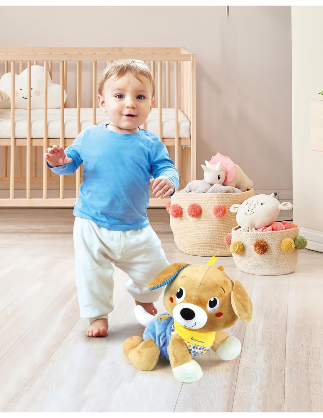 Un cagnolino per imparare a gattonare! Con pulsanti interattivi e contenuti educativi. Il morbidissimo peluche muovendosi nello spazio incentiverà il bambino a seguirlo per iniziare a gattonare. Stimola la motricità e l'attenzione. Realizzato con tessuti morbidi, resistenti e atossici.