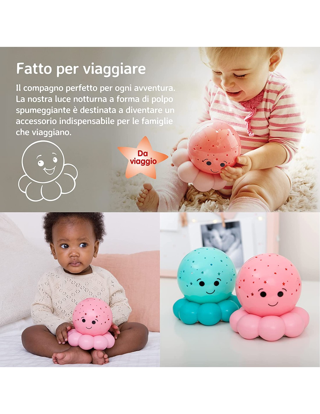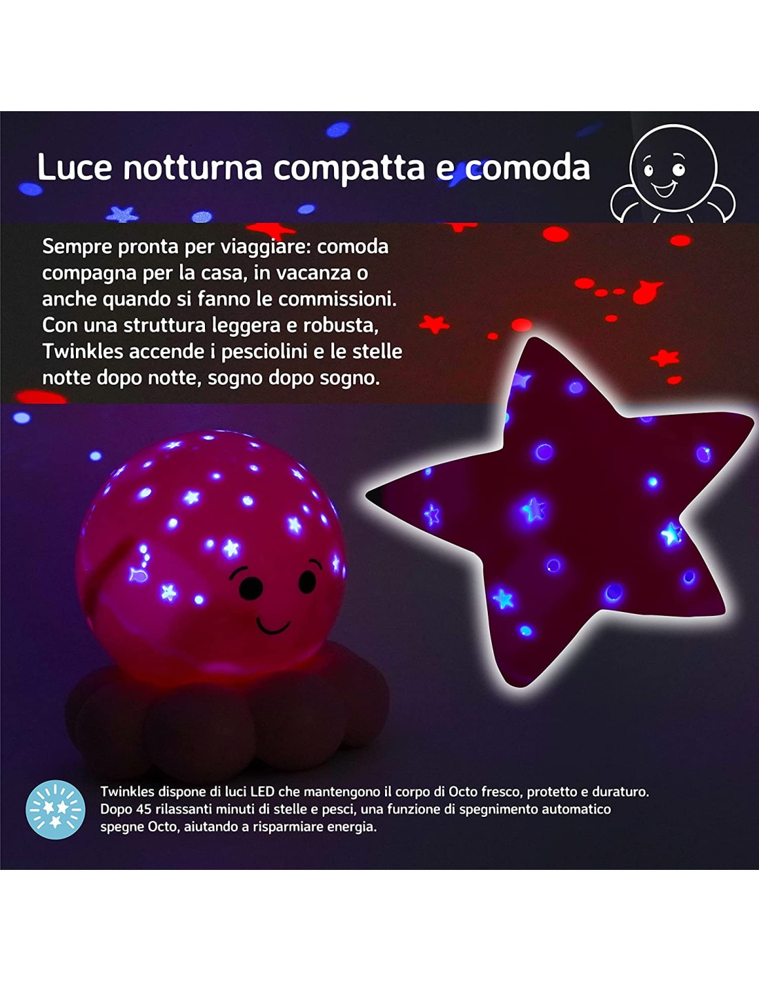 Si presenta con un design a forma di polipo di colore rosa e può essere utilizzata come compagna di sonno durante la notte o come giocattolo morbido durante il giorno. La luce notturna emette una luce soffusa e rilassante, che aiuta i bambini a sentirsi al sicuro e confortevoli durante la notte.