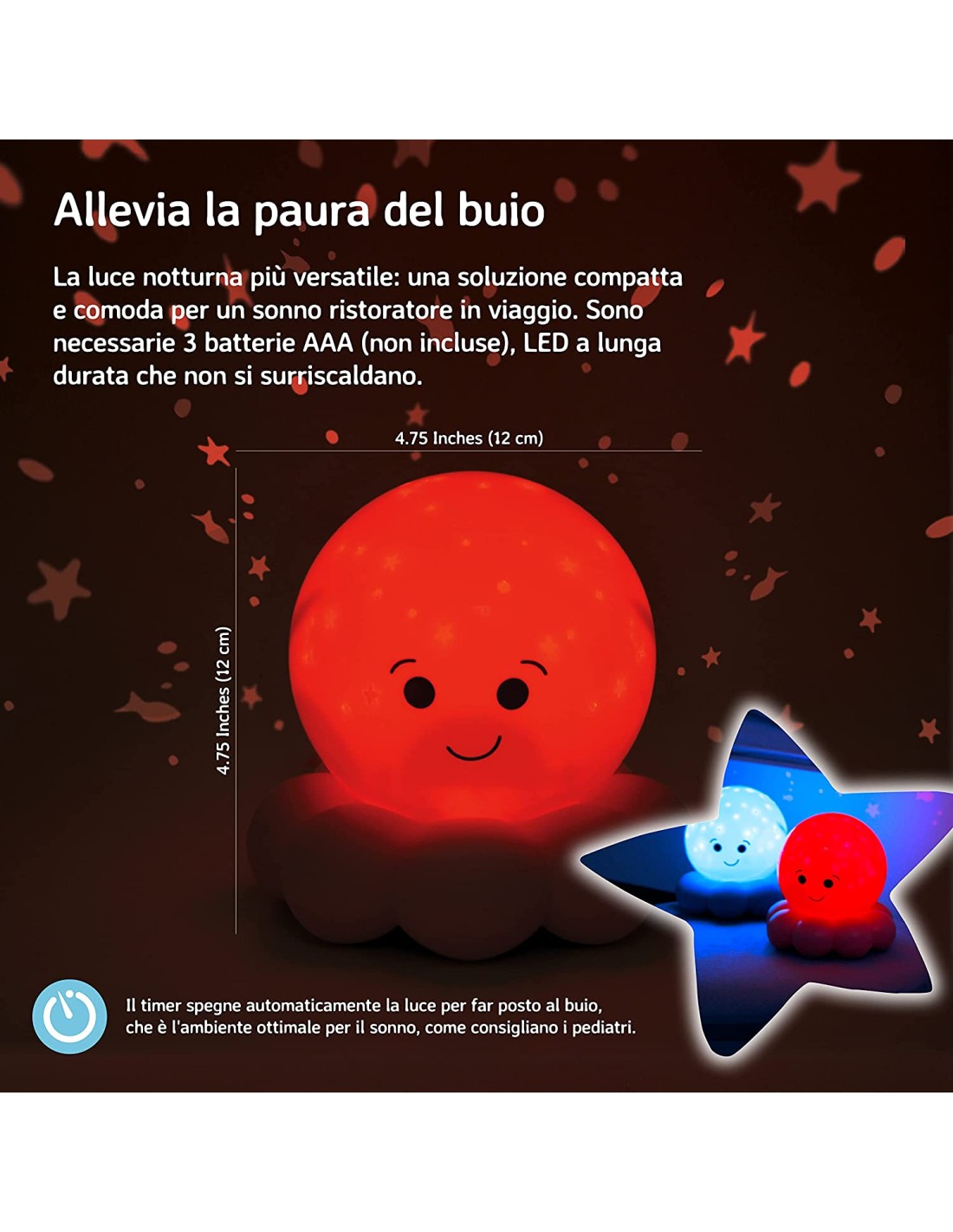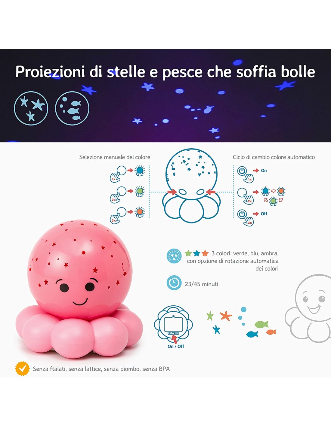 La luce può essere facilmente accesa e spenta tramite un pulsante posto sulla parte inferiore del polipo. Inoltre, è dotata di un sistema di spegnimento automatico dopo 45 minuti di utilizzo. La luce notturna OCTO ROSA è alimentata da due batterie AA (non incluse nella confezione) ed è adatta a bambini di età superiore ai 0 mesi.