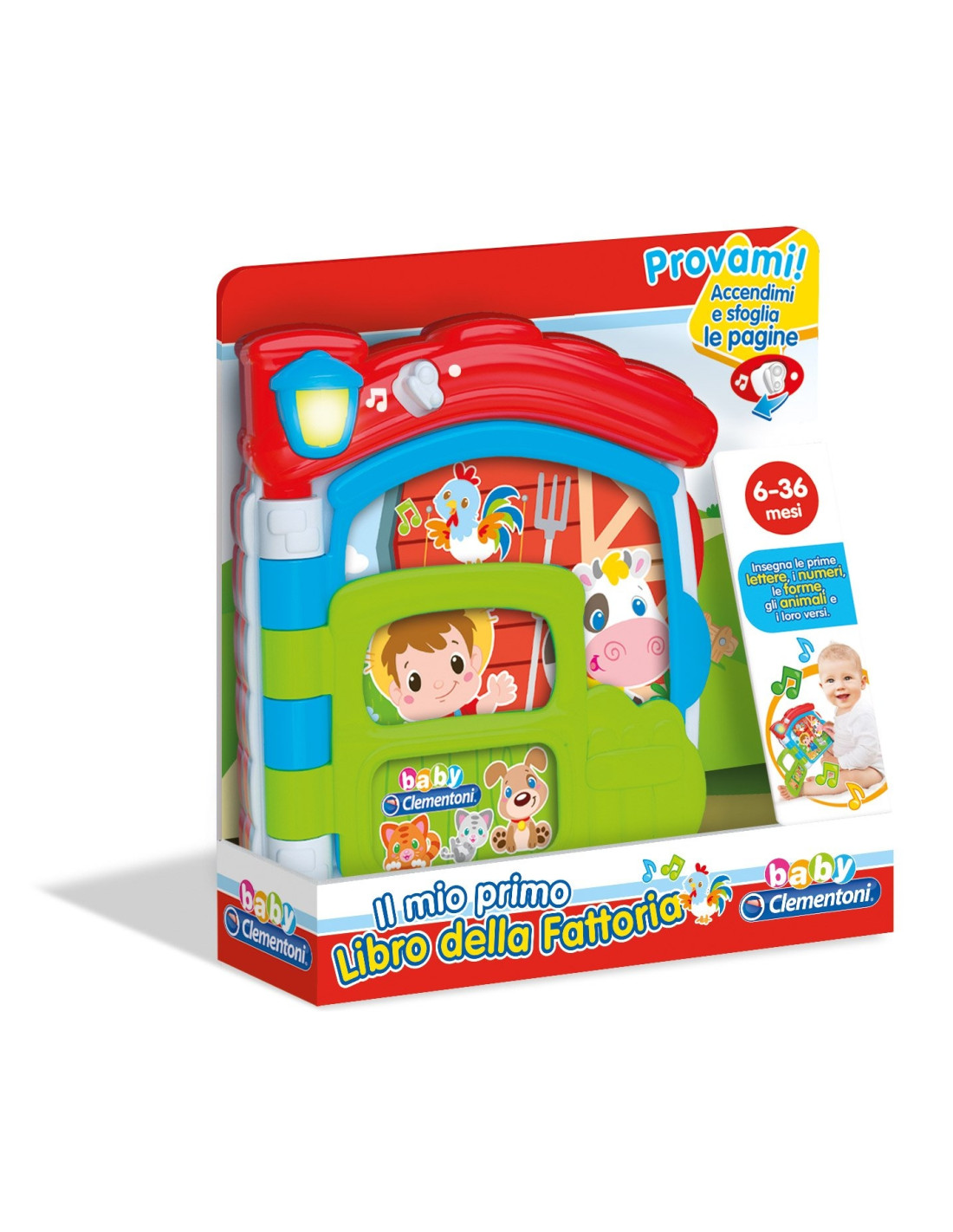 Girando le pagine e premendo il tasto luminoso sul tetto della fattoria, il bambino potrà conoscere gli animali e i loro versi, scoprire le prime lettere, i numeri e le forme