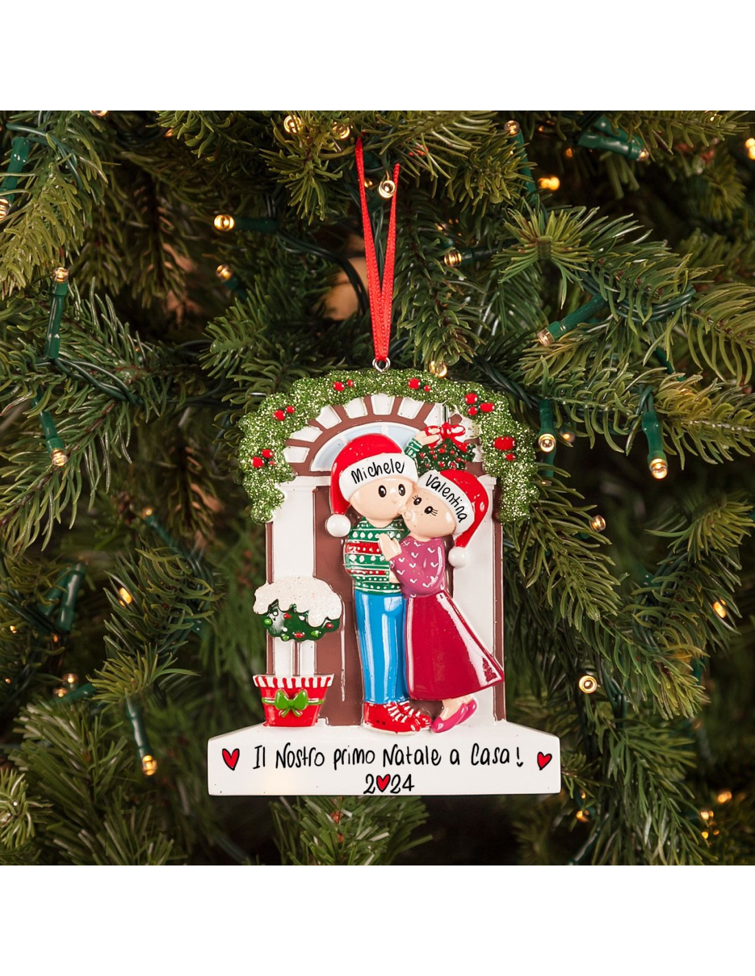 Il dolce bacio degli innamorati sotto al vischio è la decorazione romantica e divertente che non può mancare nell?albero di Natale. Le nostre decoratrici potranno personalizzarla secondo le tue indicazioni. E' possibile inserire i nomi degli innamorati sui cappelli e scrivere una frase, una data o un augurio sul cuore e sul banner bianco. Tutte le personalizzazioni sono fatte a mano, senza nessun costo aggiuntivo. Ogni prodotto acquistato sarà consegnato nella splendida Gift Box.