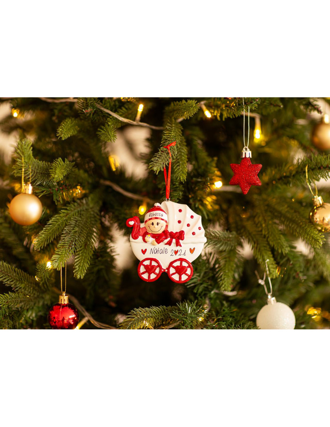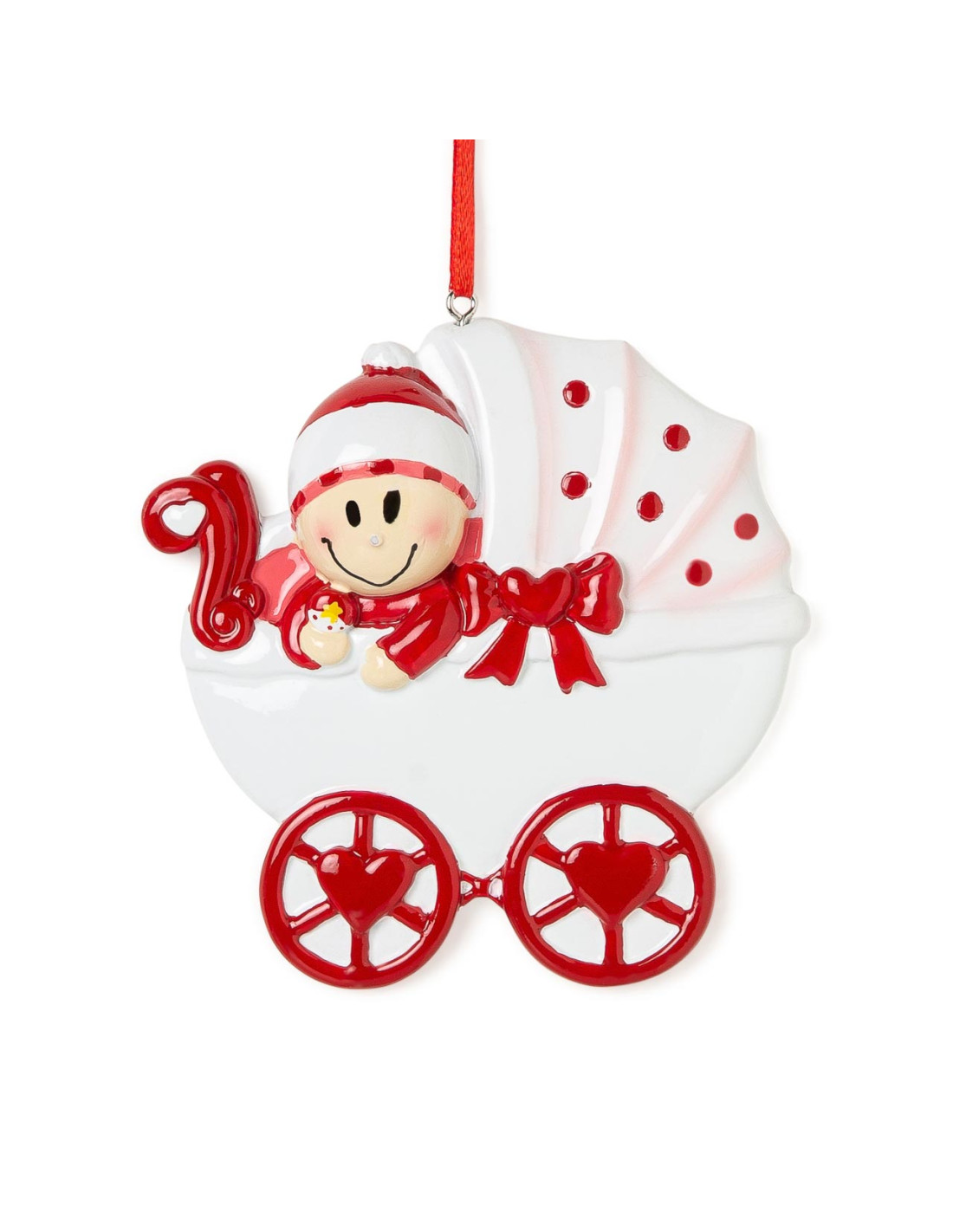 Il bimbo che fa capolino dalla sua carrozzina natalizia è una dolce decorazioni da appendere sul nostro albero con un bel messaggio per annunciare il lieto evento! Le nostre bravissime decoratrici potranno personalizzare questa decorazione con le tue indicazioni. È possibile inserire un nome sul cappellino e scrivere una frase, una dedica, una data o un augurio sulla carrozzina. Tutte le personalizzazioni sono fatte a mano, senza nessun costo aggiuntivo. Ogni decorazione acquistata sarà consegnata nella Gift Box natalizia.