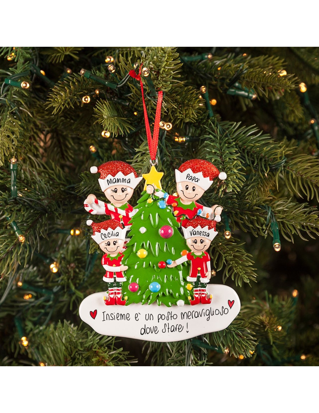 La simpatica decorazione di elfi è quello che ci vuole per rallegrare ancora di più il vostro albero di Natale! È possibile inserire i nomi dei 4 personaggi sui cappellini e scrivere una dedica o un augurio sul banner bianco. Tutte le personalizzazioni sono fatte a mano, senza nessun costo aggiuntivo. Ogni prodotto acquistato sarà consegnato nella splendida Gift Box.