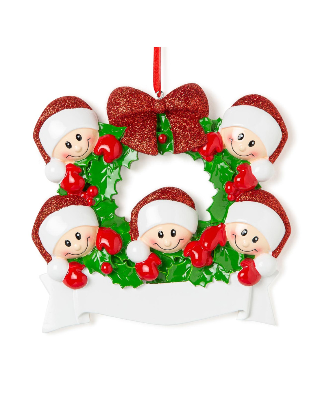 La ghirlanda con il fiocco rosso è un portafortuna da appendere alla porta di casa per Natale. In questo caso la decorazione è da appendere all'albero di Natale ed è pronta per essere personalizzata inserendo i nomi sui cappellini dei 5 personaggi e scrivendo una breve frase, un augurio o una data sul banner bianco. Le nostre bravissime decoratrici scriveranno a mano ogni tuo desiderio, senza nessun costo aggiuntivo. Ogni decorazione sarà consegnata nella splendida Gift Box.