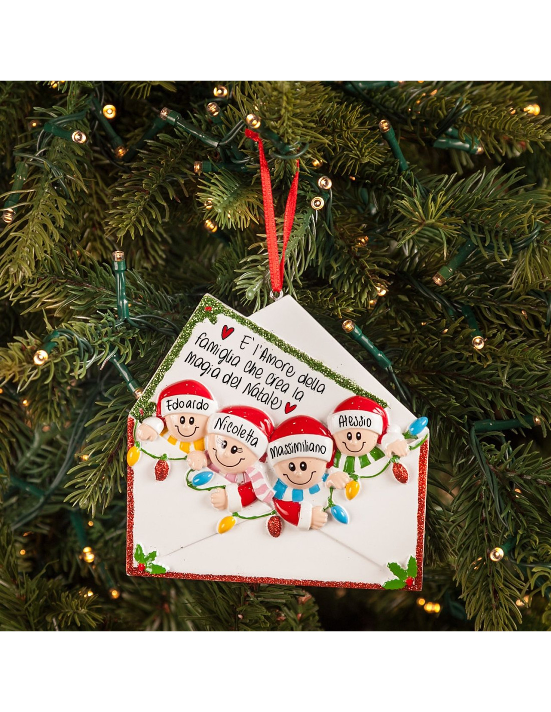 Dopo aver scritto la letterina, piena di desideri e sogni, andiamo a spedire la posta per Babbo Natale. La decorazione da appendere all?albero è pronta per essere personalizzata inserendo i nomi sul cappellino dei 4 personaggi e scrivendo una frase, un augurio o una data sul banner bianco. Le nostre bravissime decoratrici provvederanno a scrivere a mano ogni tuo desiderio, senza nessun costo aggiuntivo. Ogni decorazione sarà consegnata nella splendida Gift Box.