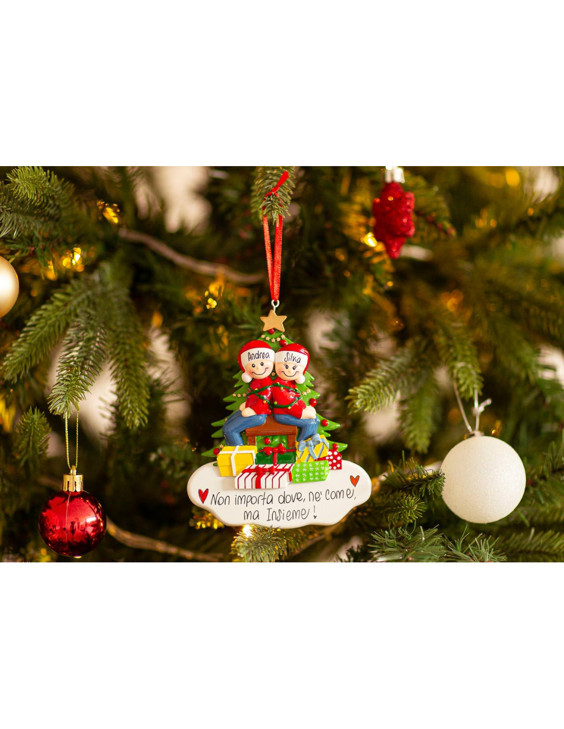 Un'atmosfera natalizia piena di allegria con lucine colorate e pacchi regalo sotto l'albero. La decorazione è pronta per essere personalizzata inserendo i nomi sui cappellini dei 2 personaggi e scrivendo una breve frase, un augurio o una data sul banner bianco. Le nostre bravissime decoratrici scriveranno a mano ogni tuo desiderio, senza nessun costo aggiuntivo. Ogni decorazione sarà consegnata nella splendida Gift Box.