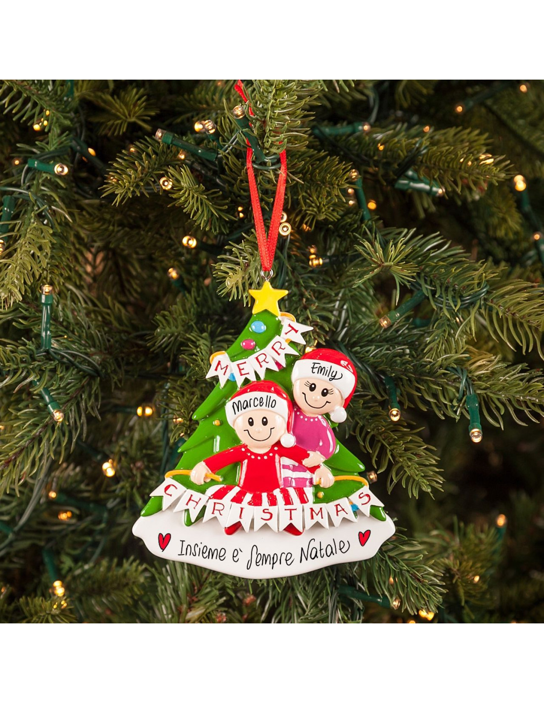 "Merry Christmas!" La decorazione perfetta per addobbare il tuo albero e celebrare il Natale! La decorazione è pronta per essere personalizzata inserendo i nomi sui cappellini dei personaggi e scrivendo una breve frase, un augurio o una data sul banner bianco. Le nostre bravissime decoratrici scriveranno a mano ogni tuo desiderio, senza nessun costo aggiuntivo. Ogni decorazione sarà consegnata nella splendida Gift Box.