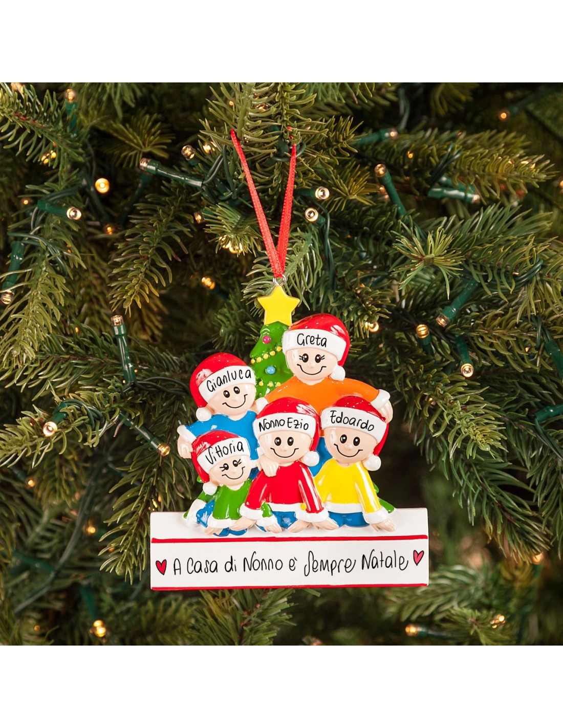 Tutti insieme davanti l'albero di Natale per una foto di Famiglia! La decorazione è pronta per essere personalizzata inserendo i nomi sui cappellini dei 5 personaggi e scrivendo una breve frase, un augurio o una data sul banner bianco. Le nostre bravissime decoratrici scriveranno a mano ogni tuo desiderio, senza nessun costo aggiuntivo. Ogni decorazione sarà consegnata nella splendida Gift Box.