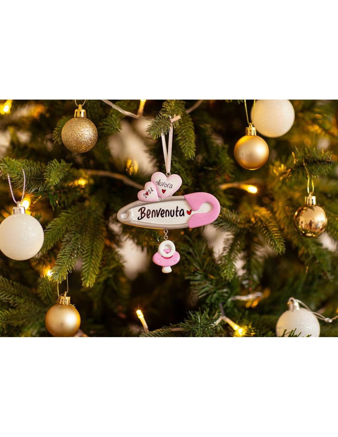 La spilla si trasforma in una splendida decorazione da rendere unica e appendere sull?albero di Natale. La spilla bimba è personalizzabile, grazie al cuore, dove è possibile inserire un nome e il banner bianco pronto ad accogliere una citazione, una data o una frase che le nostre decoratrici scriveranno seguendo le tue indicazioni. Tutte le personalizzazioni sono fatte a mano, senza nessun costo aggiuntivo. Ogni decorazione acquistata sarà consegnata nella Gift Box natalizia.