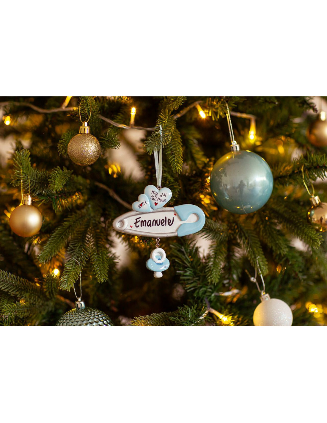 La spilla si trasforma in una splendida decorazione da rendere unica e appendere sull?albero di Natale. La spilla bimbo è personalizzabile, grazie al cuore, dove è possibile inserire un nome e il banner bianco pronto ad accogliere una citazione, una data o una frase che le nostre decoratrici scriveranno seguendo le tue indicazioni. Tutte le personalizzazioni sono fatte a mano, senza nessun costo aggiuntivo. Ogni decorazione acquistata sarà consegnata nella Gift Box natalizia.