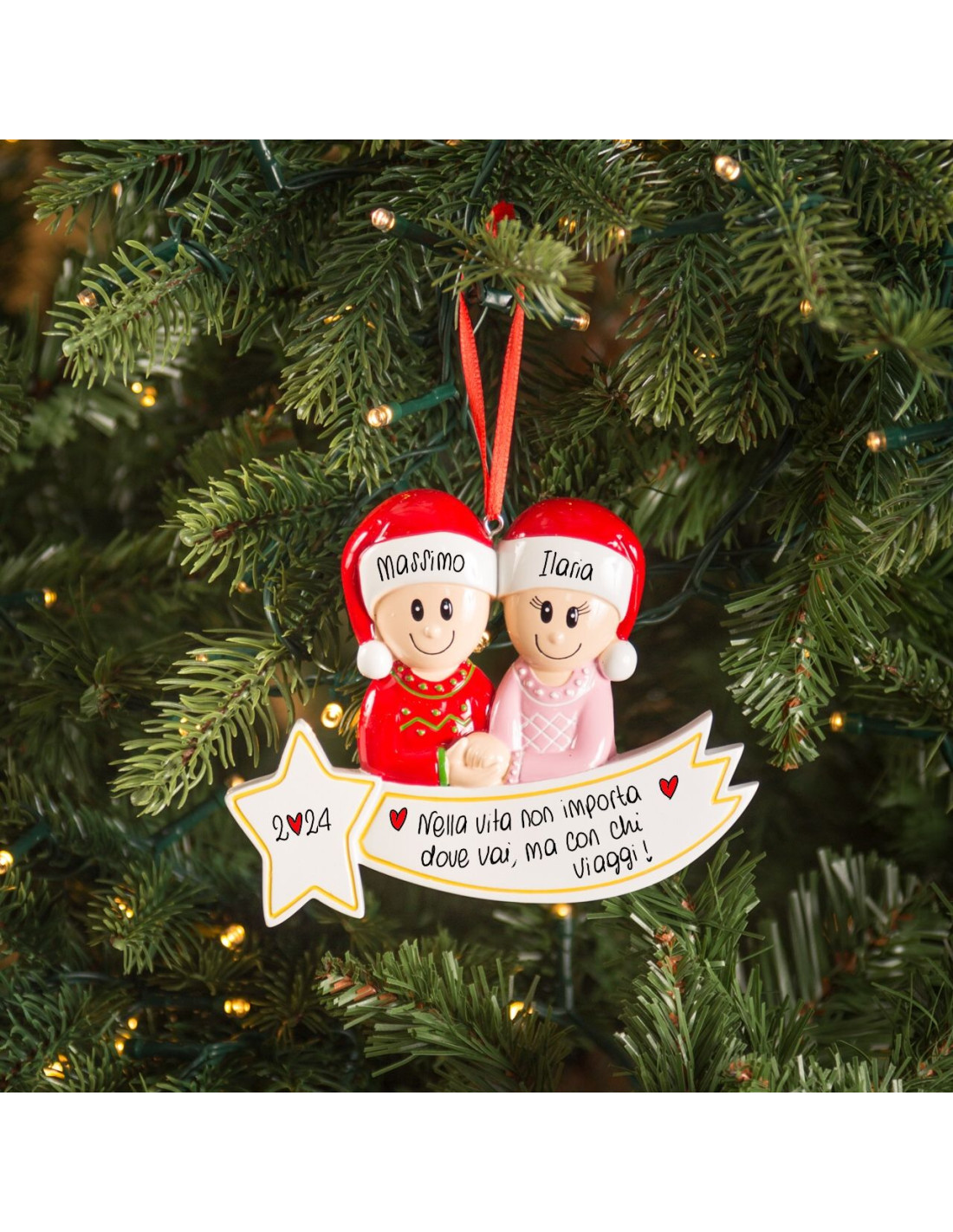Si dice che i sogni son desideri, e sono più grandi se condivisi E la stella cometa è lì a ricordarci che ogni desiderio si avvera se restiamo uniti! La decorazione è pronta per essere personalizzata inserendo i nomi sui cappellini dei 2 personaggi e scrivendo una breve frase, un augurio o una data sul banner bianco. Le nostre bravissime decoratrici scriveranno a mano ogni tuo desiderio, senza nessun costo aggiuntivo. Ogni decorazione sarà consegnata nella splendida Gift Box.
