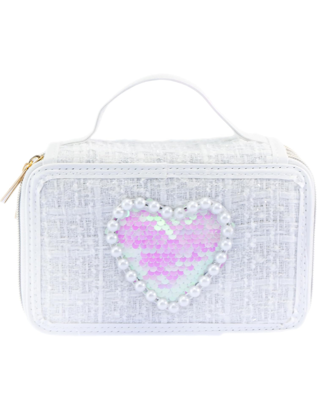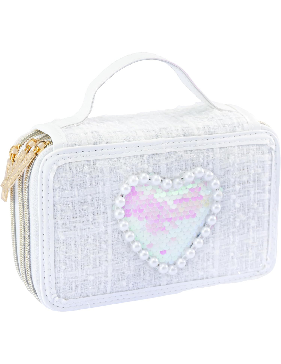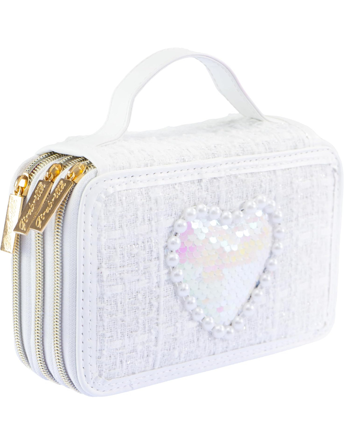 GIRABRILLA TWEED ASTUCCIO: astuccio bianco a tre piani in tessuto morbido, con maniglia e decorazioni in paillettes reversibili che cambiano colore, adatto ai bambini e realizzato con materiali di qualità.