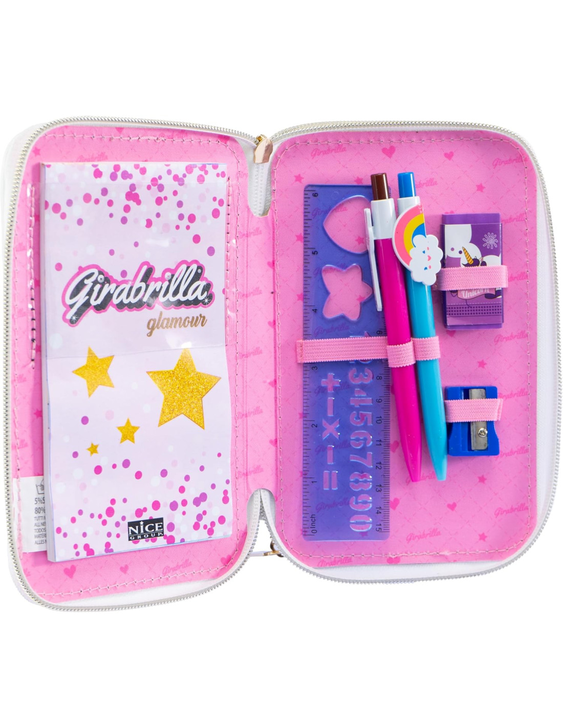 CONTENUTO: 16 pennarelli, 16 matite colorate, 1 notebook per disegnare e colorare, 2 penne, 1 righello, 1 gomma, 1 temperino.