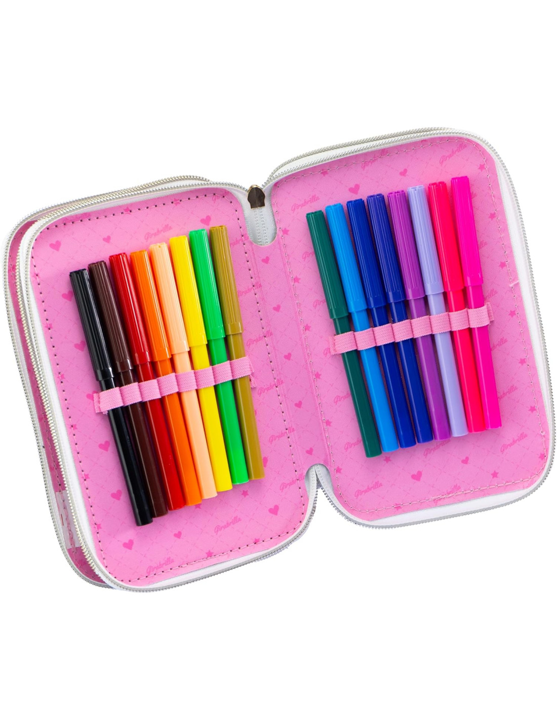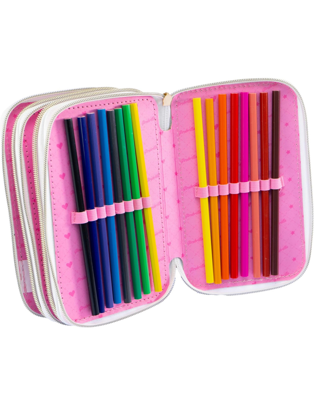 CARATTERISTICHE: l'astuccio a 3 scomparti è chiuso con comode e pratiche cerniere zip ed è rivestito esternamente ed internamente da tessuto intrecciato e perline. I materiali con cui è stato realizzato l'astuccio portapenne sono testati e sicuri, rispettano le normative europee e risultano resistenti all'acqua.