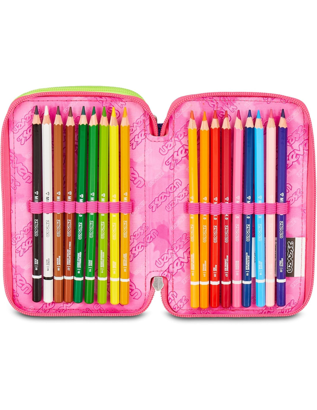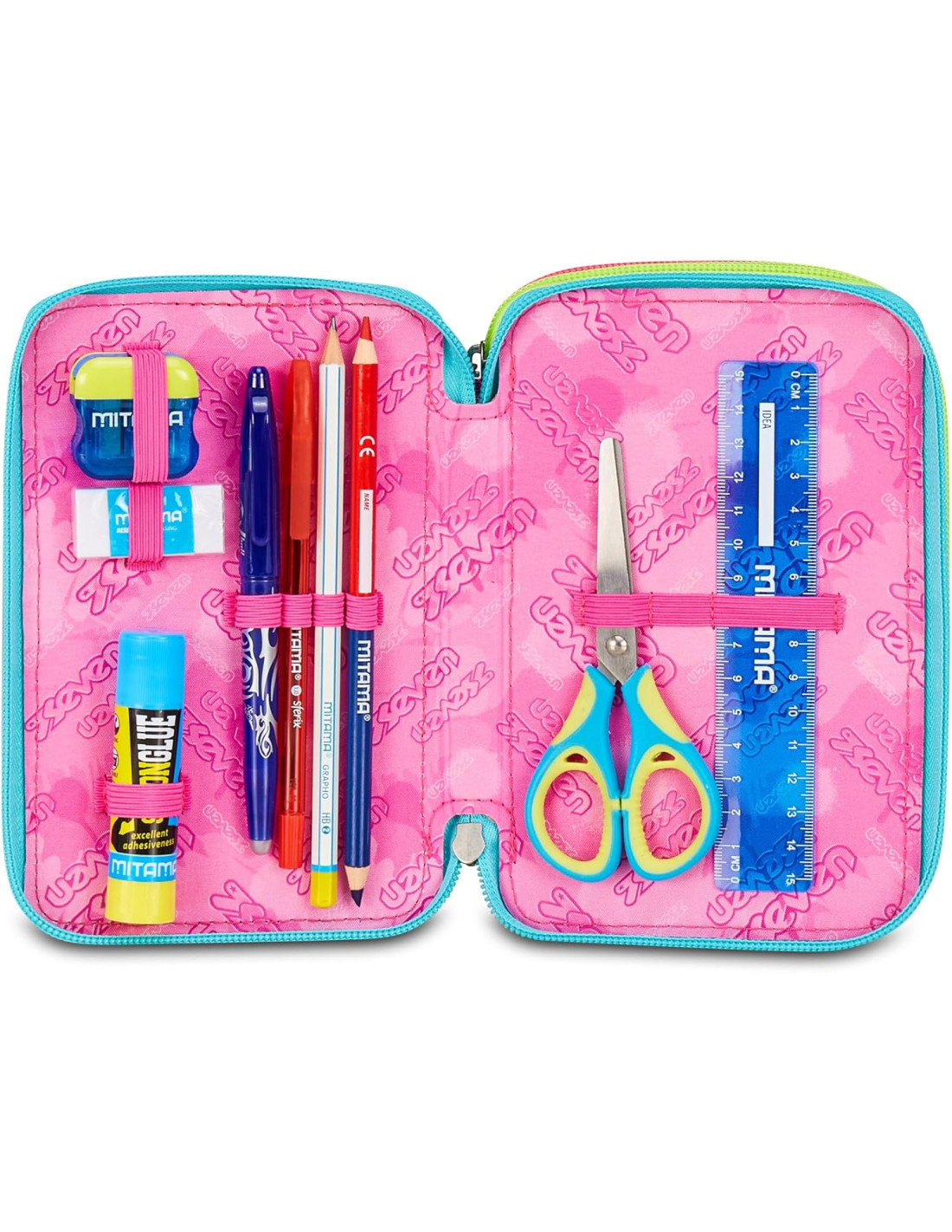 Altre caratteristiche: CONTENUTO 45 PEZZI: 1 penna cancellabile blu, 1 penna sfera rossa, 18 pastelli a colori 4.0 esagonali, 18 pennarelli superlavabili punta 3.0, 1 matita grafite esagonale HB, 1 colla gialla azzurra, 1 gomma bianca con cartoncino stampato, 1 temperino barilotto 2 fori, 1 righello trasparente, 1 matita bicolor rosso/blu, 1 paio di forbici in metallo Perfetto per accompagnare le giornate scolastiche dei bambini, questo astuccio a triplo scomparto è la soluzione ideale per organizzare al meglio tutto l'occorrente.