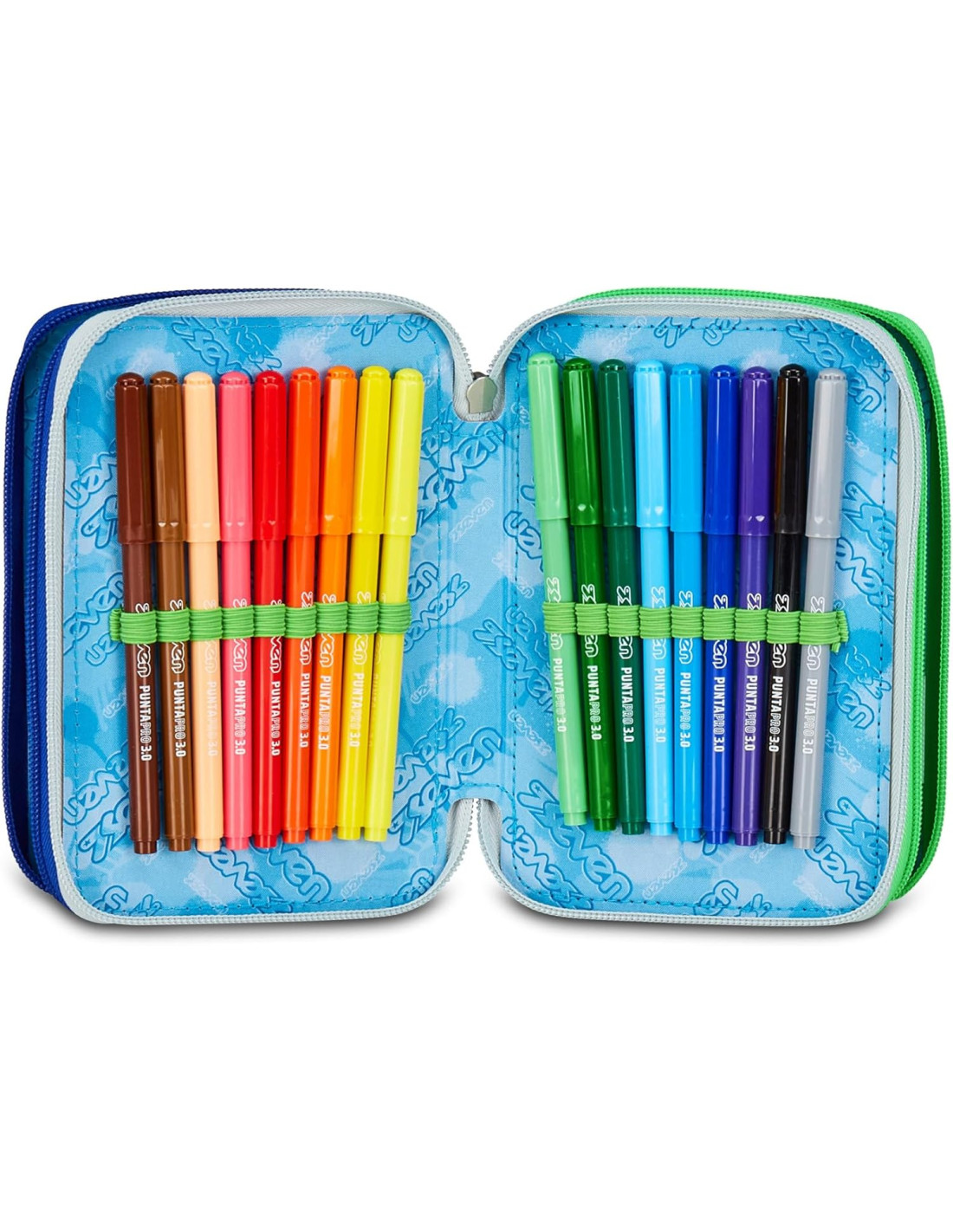 Altre caratteristiche: CONTENUTO 45 PEZZI: 1 penna cancellabile blu, 1 penna sfera rossa, 18 pastelli a colori 4.0 esagonali, 18 pennarelli superlavabili punta 3.0, 1 matita grafite esagonale HB, 1 colla gialla azzurra, 1 gomma bianca con cartoncino stampato, 1 temperino barilotto 2 fori, 1 righello trasparente, 1 matita bicolor rosso/blu, 1 paio di forbici in metallo Perfetto per accompagnare le giornate scolastiche dei bambini, questo astuccio a triplo scomparto è la soluzione ideale per organizzare al meglio tutto l'occorrente.