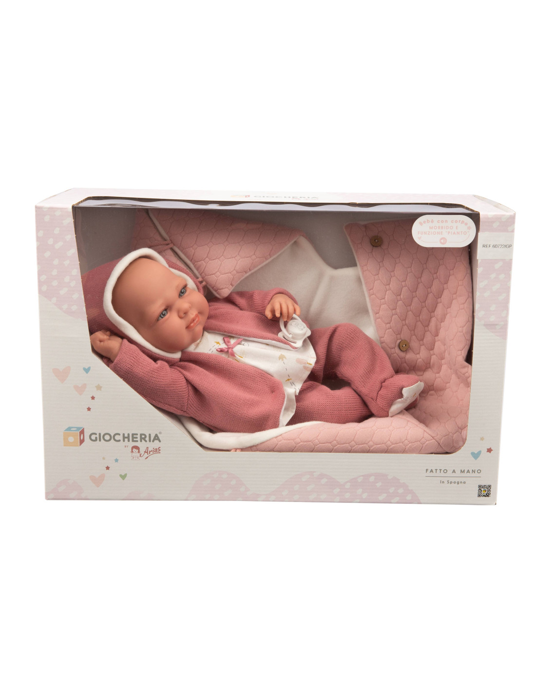 Bambola ELEGANCE 40 CM CRIS con meccanismo a piangere vestita nei toni rosa e bianco con coperta abbinata. Include coperta e ciuccio. Cris piacerebbe che ogni sera si riavvolgerà con una morbida coperta per avere i sogni più dolci. Questo bambino con il corpo morbido e gli arti in vinile con un piacevole aroma di vaniglia. I suoi vestiti e la sua coperta nei toni rosa e bianco sono realizzati con tessuti di alta qualità. Avrete bisogno di tutte le cure del mondo perché se togliete il ciuccio piangerà. Include accessori ciuccio e coperta.