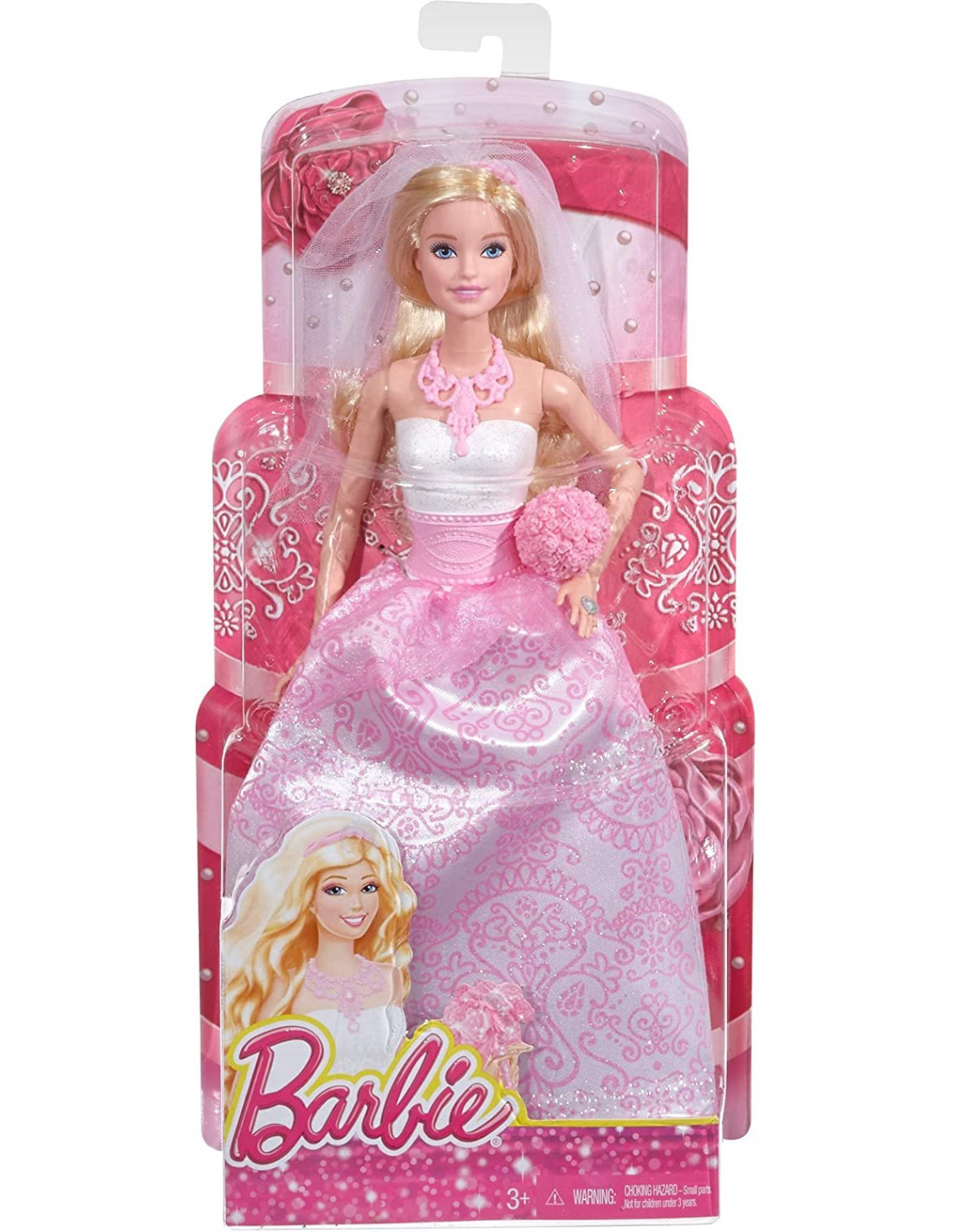 Barbie sposa è moderna grazie alla sua silhouette semplice a tinte rosa con la gonna a stampe glitter Con scarpe e bouquet da tenere in mano Dotata di accessori tra quale collier e velo attacato ad un cerchietto.
