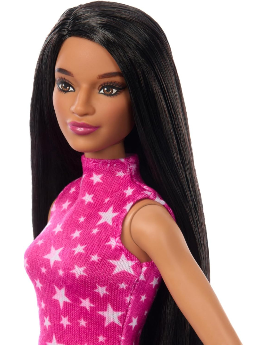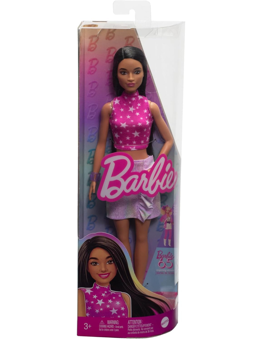 MATTELBarbie - Bambola Fashionistas n. 215 da Collezione 65° Anniversario, con Capelli Lisci Neri, Top Rosa con Stampa a Stelle e Gonna cangiante
