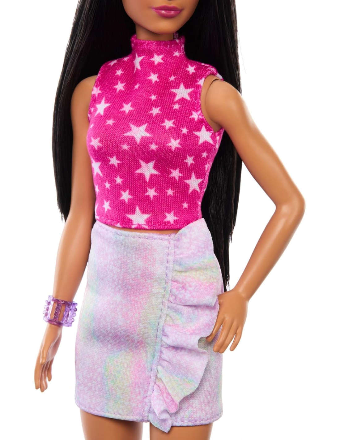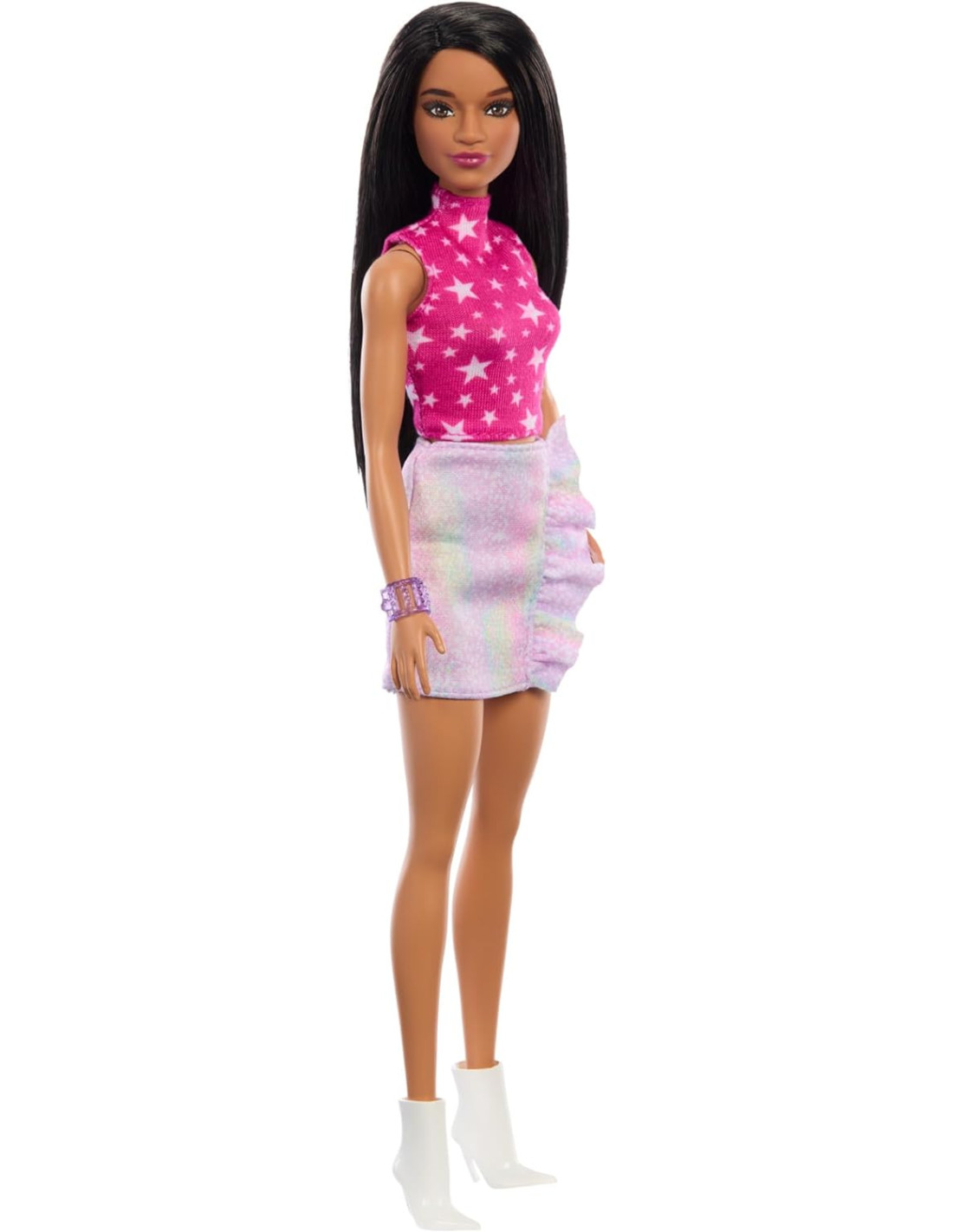 Barbie celebra 65 anni di stile inconfondibile donando un tocco moderno ai look iconici e tanta unicità! Ispirata al look Rockers del 1986, la bambola Barbie Fashionistas sfoggia un top rosa con stampa a stelle e una gonna cangiante con volant che risplende sotto i riflettori! Con gli stivali bianchi alla moda e un braccialetto colorato questo outfit sale in cima alle classifiche! I capelli neri sono lunghi, lisci e con la riga laterale, perfetti per ogni occasione! Con infinite possibilità di stile e narrazione, le bambole Barbie sono un regalo fantastico per fan, collezionisti e bambini e bambine dai 3 anni in su!