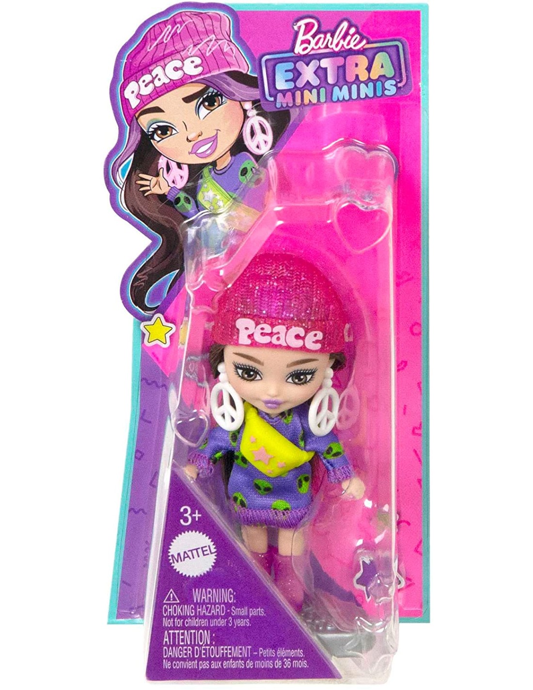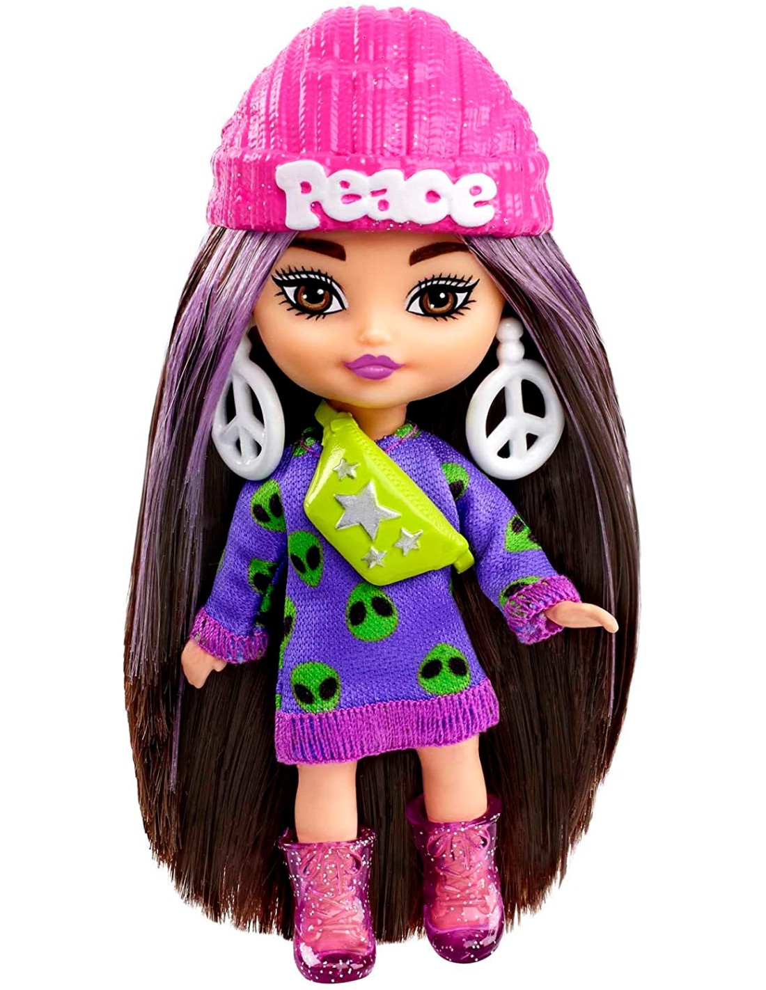 Barbie - Barbie Extra Mini Minis, Bambola con capelli castani e abito di maglia con alieno, abiti e accessori con simbolo della pace, HLN46