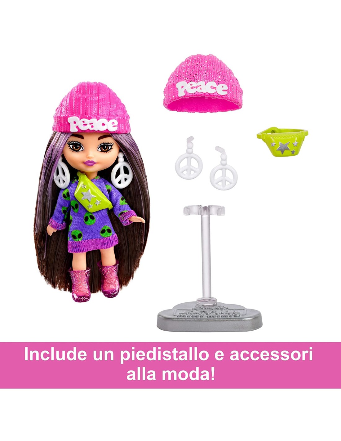 Le Barbie Extra Mini Minis sono mini bambole da 8,25 cm che sfoggiano abiti unici e acconciature originali. Questa bambola Barbie Extra Mini Minis ha lunghi capelli castani con ciocche lilla e indossa un abito di maglia con la stampa di un alieno per un look spaziale! Quattro accessori le donano un look davvero cool: un berretto con simbolo della pace, orecchini oversize a forma di simbolo della pace, marsupio fluo e stivali rosa glitterati. Con un outfit così esclusivo, questa bambola è perfetta per l'esposizione! Include un piedistallo per bambole Barbie Extra Mini Minis con logo. Le bambole Barbie Extra Mini Minis incoraggiano a sviluppare la creatività e lo stile, oltre che a giocare con la moda. Il regalo perfetto per bambini e bambine che amano la moda, ma soprattutto lo stile extra!