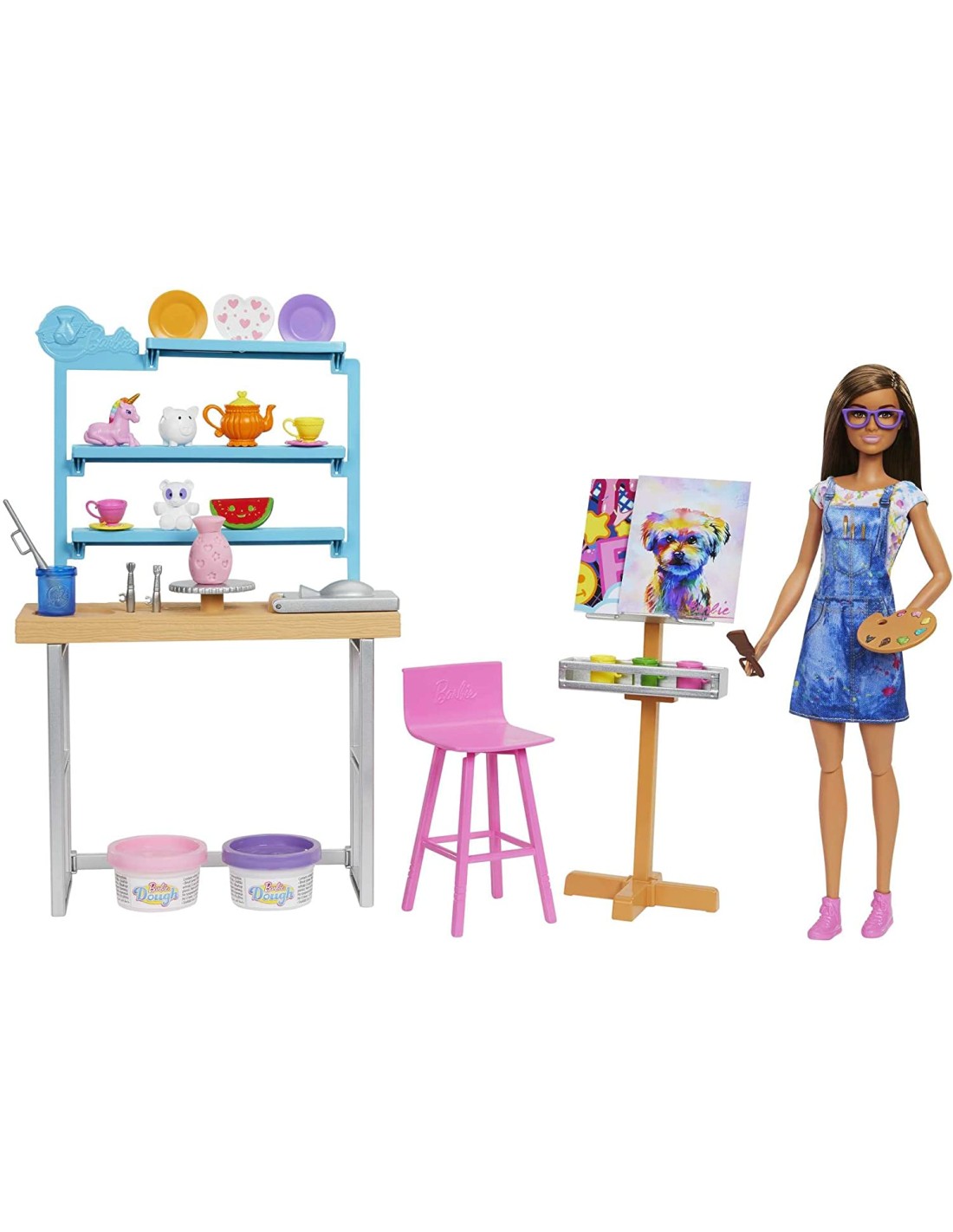 ALLA SCOPERTA DELLA CREATIVITÀ con Barbie e oltre 25 accessori. I bambini possono creare vasi con la pasta di Barbie o sperimentare favolosi effetti di cambio colore su 3 pezzi con l'acqua ghiacciata CREARE ARTE ALL'INFINITO. I bambini adoreranno decorare il vaso e creare stampi con la pasta riutilizzabile. Maialino, piatto e orsacchiotto possono essere trasformati all'infinito con acqua fredda IL PLAYSET INCLUDE Barbie, cavalletto, 2 quadri, postazione di lavoro, sgabello, 4 secchi di vernice, 2 vasetti di pasta, 3 attrezzi, spugna, tavolozza, 3 pezzi cambia colore. Adatto a bambini 3+ anni PER INVENTARE STORIE ARTISTICHE. La bambola si muove con ginocchia pieghevoli per sedersi al cavalletto e dipingere. I bambini possono imparare tecniche di rilassamento con la pittura e la ceramica IL REGALO PERFETTO per bambini dai 3 anni. I bambini adoreranno sperimentare gli hobby e le professioni artistiche creando storie emozionanti. La bambola non può stare in piedi da sola