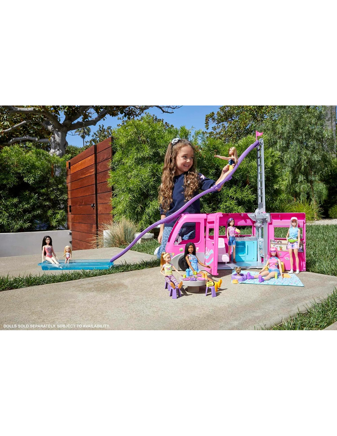Barbie - Camper dei Sogni Playset con Veicolo, con Ruote, Piscina, Scivolo, 7 Aree Gioco e Oltre 60 Accessori da Campeggio, 3+ Anni, HCD46