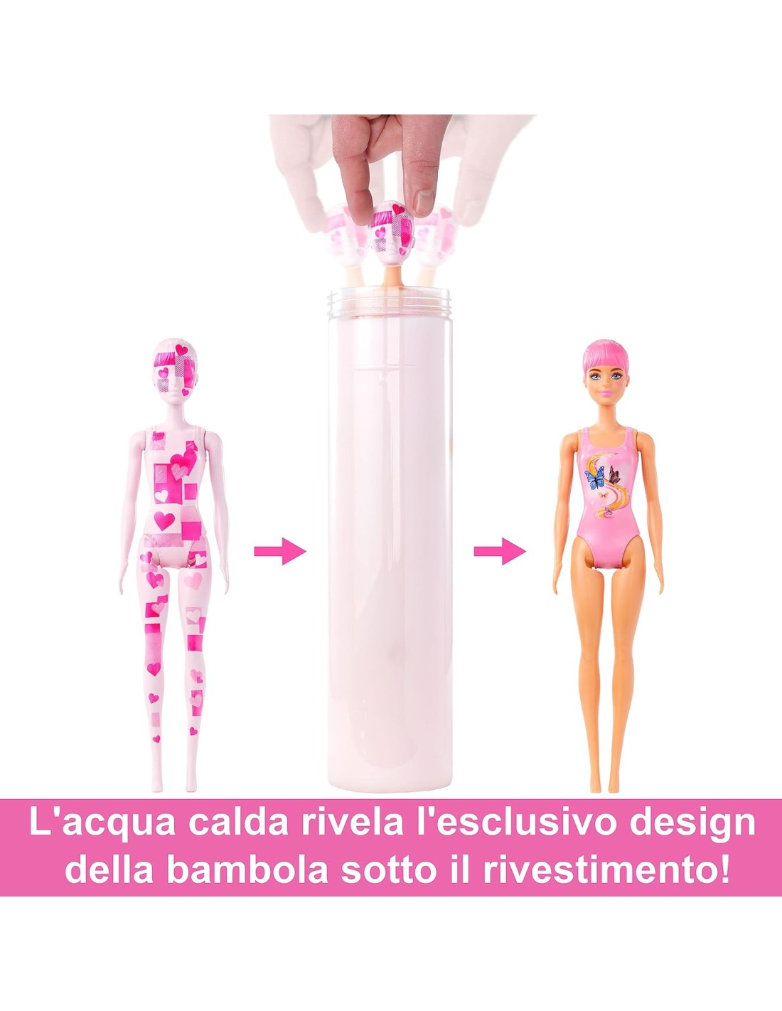 Inizia questa esperienza rimuovendo lo strato esterno della confezione, poi svita la parte superiore del tubo ed estrai la bambola Barbie: il suo look è nascosto da un rivestimento patchwork rosa Color Reveal e da sacchettini dal contenuto misterioso!