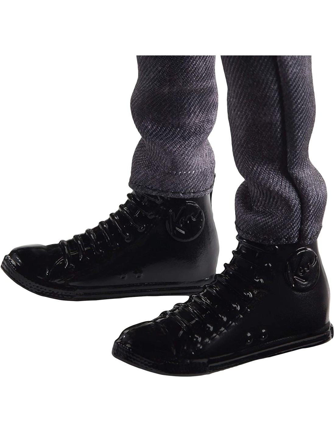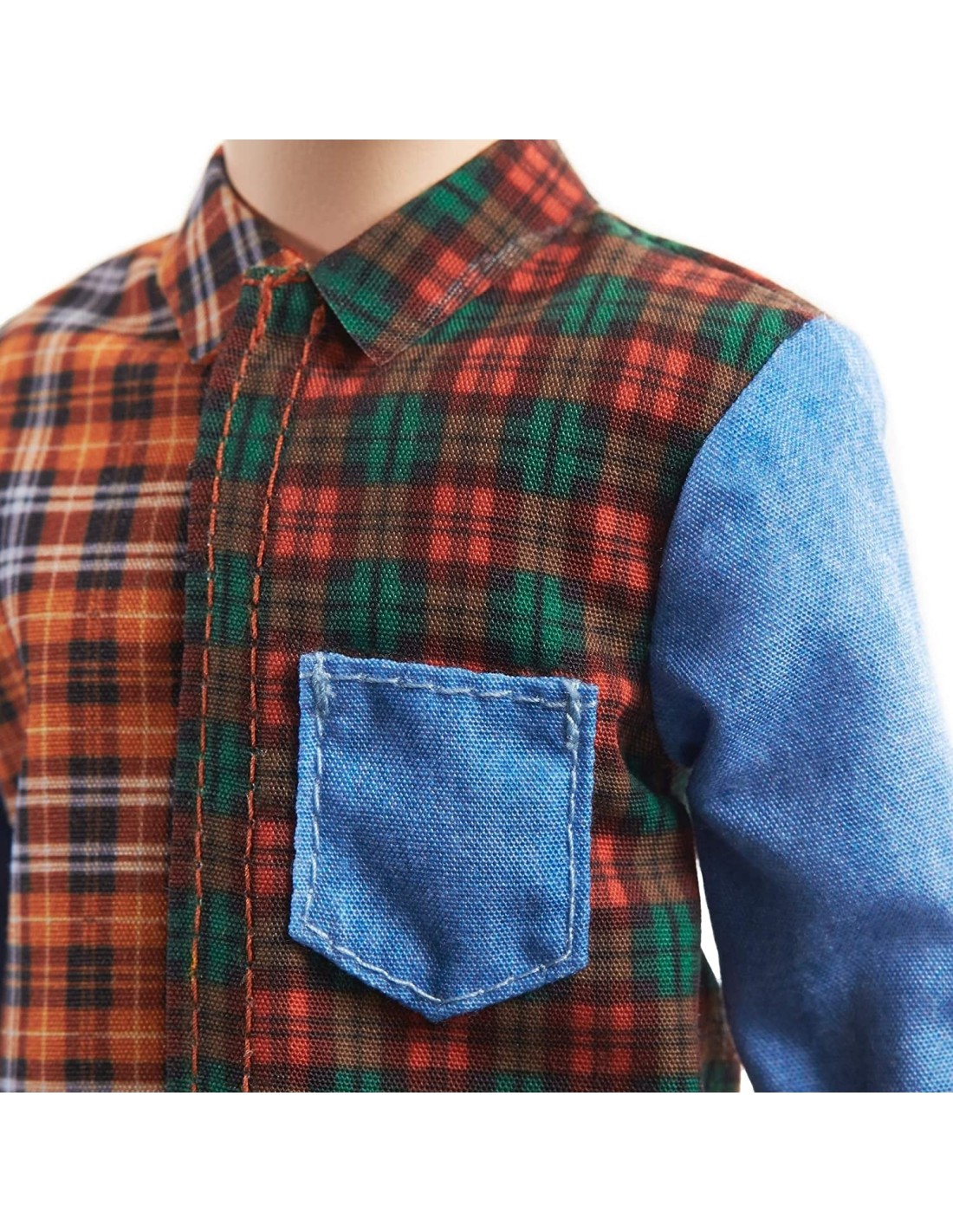 La bambola Ken è più sottile del corpo originale e indossa una camicia a quadri misti e denim con pantaloni in denim nero.