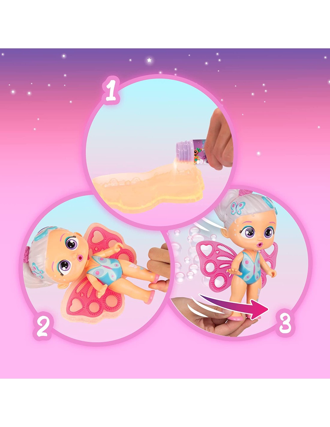 LE SUE ALI FANNO LE BOLLE: Mescola acqua e sapone nella bacinella, immergi le ali nella soluzione liquida e agita la bambola in aria per fare le bolle.