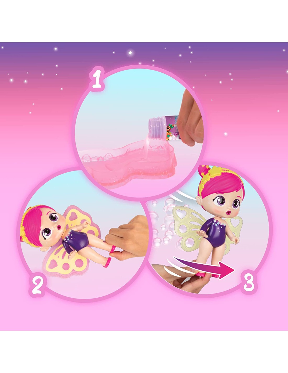 LE SUE ALI FANNO LE BOLLE: Mescola acqua e sapone nella bacinella, immergi le ali nella soluzione liquida e agita la bambola in aria per fare le bolle.