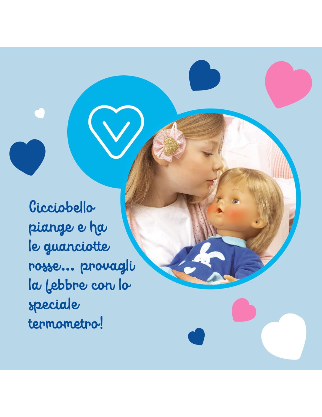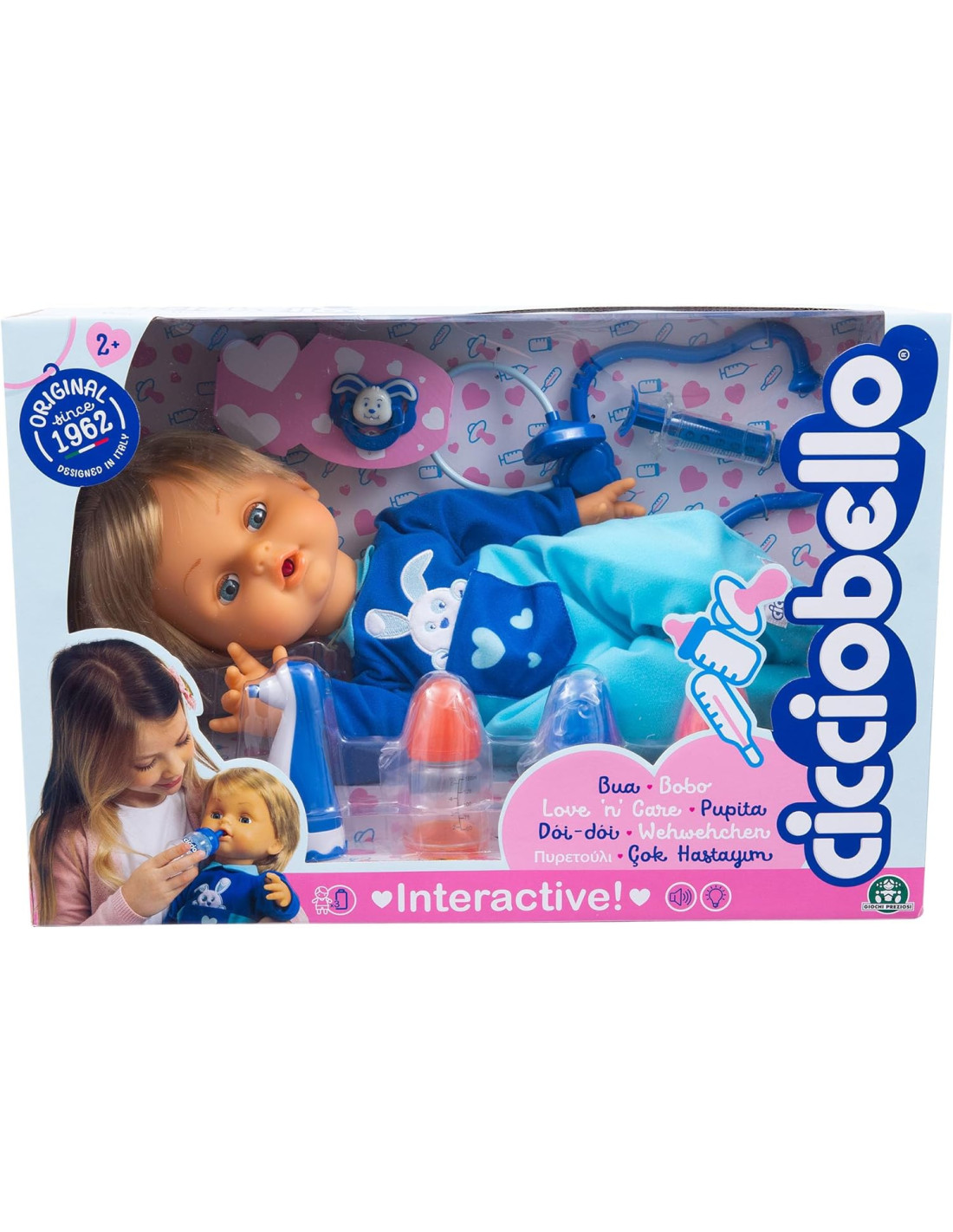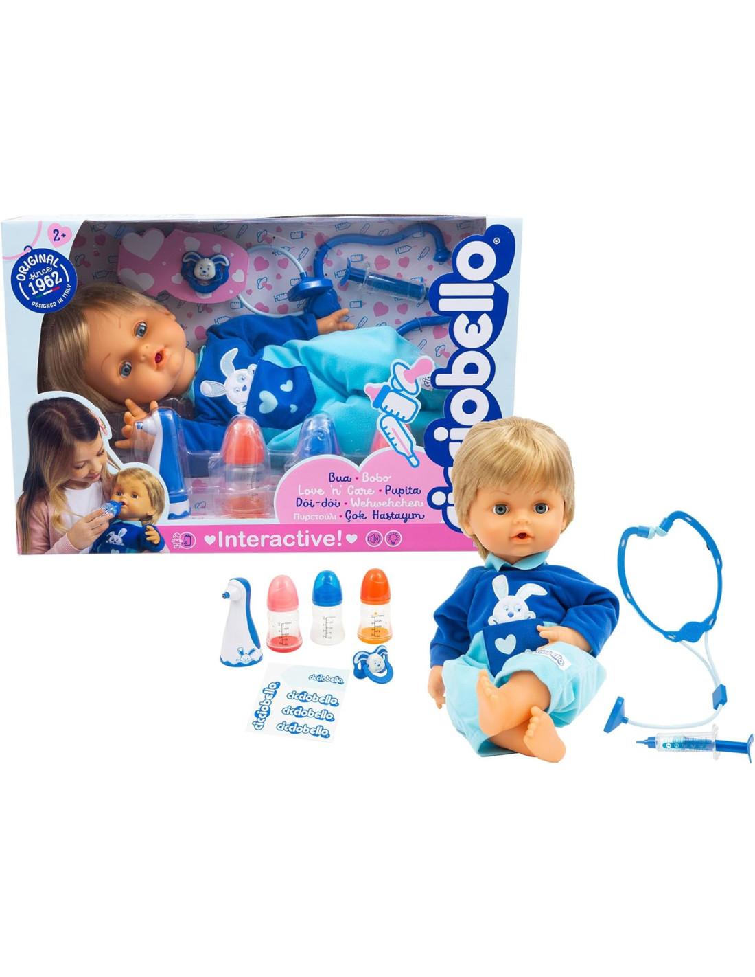 CICCIOBELLO BUA: Cicciobello ha la bua e ha bisogno delle tue cure! Misura la febbre con il termometro, ascolta il suo cuore con lo stetoscopio e tanto altro ancora CICCIOBELLO CON GLI ACCESSORI PER CURARLO: utilizza gli strumenti per curare Cicciobello, termometro, stetoscopio e altri strumenti tutti da scoprire GIOCO INTERATTIVO: scopri esperienze ludiche sempre diverse con Cicciobello Bua, il bambolotto che reagisce alle cure del bambino CURA COME UN GENITORE: divertiti a prenderti cura di Cicciobello Bua come se fosse un vero bambino, utilizzando il ciuccio per farlo smettere di piangere CICCIOBELLO: dopo 60 anni continua a conquistare intere generazioni di bambine, con Cicciobello l'emozionante esperienza di essere mamma rivive in un gioco senza tempo