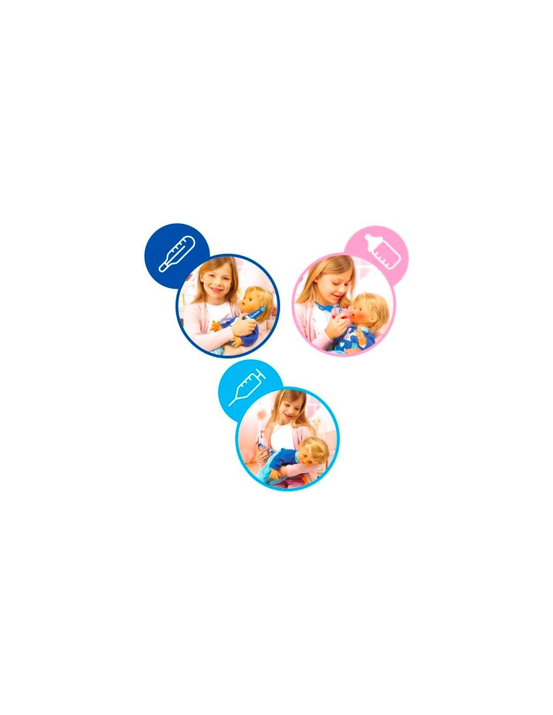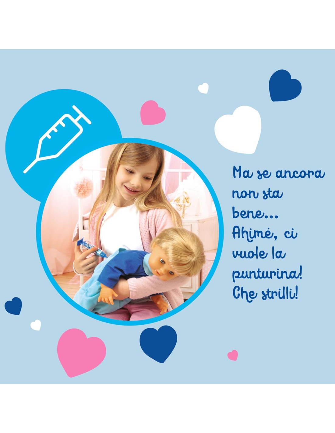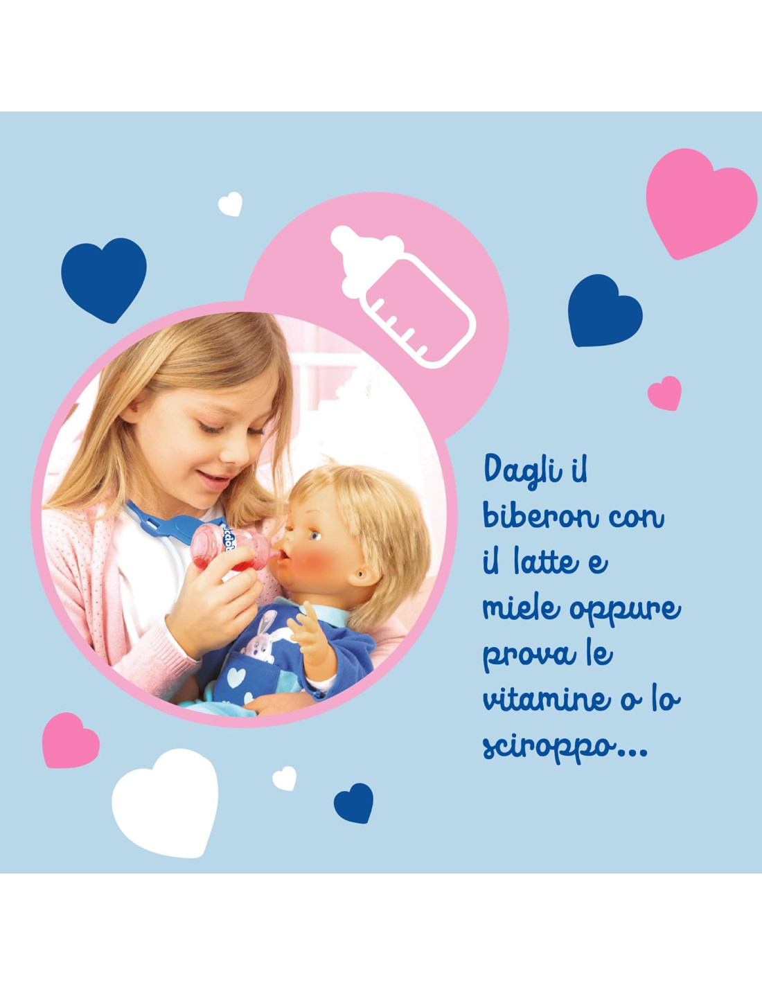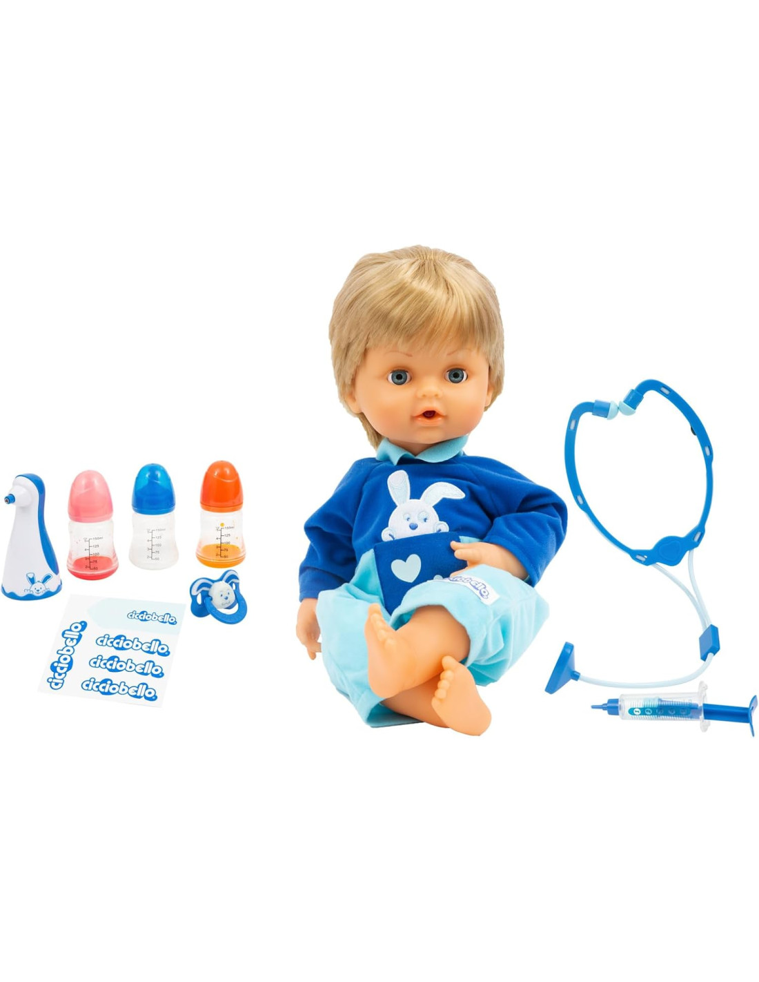 CICCIOBELLO BUA: Cicciobello ha la bua e ha bisogno delle tue cure! Misura la febbre con il termometro, ascolta il suo cuore con lo stetoscopio e tanto altro ancora CICCIOBELLO CON GLI ACCESSORI PER CURARLO: utilizza gli strumenti per curare Cicciobello, termometro, stetoscopio e altri strumenti tutti da scoprire GIOCO INTERATTIVO: scopri esperienze ludiche sempre diverse con Cicciobello Bua, il bambolotto che reagisce alle cure del bambino CURA COME UN GENITORE: divertiti a prenderti cura di Cicciobello Bua come se fosse un vero bambino, utilizzando il ciuccio per farlo smettere di piangere CICCIOBELLO: dopo 60 anni continua a conquistare intere generazioni di bambine, con Cicciobello l'emozionante esperienza di essere mamma rivive in un gioco senza tempo