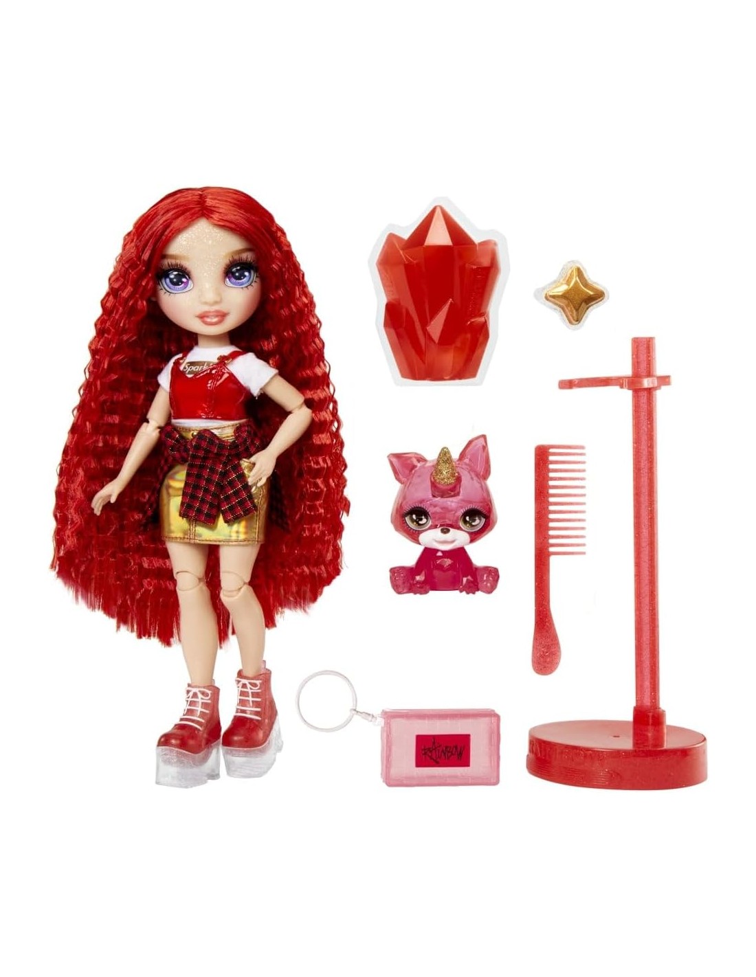 ISPIRA CREATIVITÀ: Scopri e gioca con le tue bambole preferite Rainbow High in straordinari modi magici, ogni bambola è venduta con uno speciale animale da compagnia, abiti personalizzabili e un kit slime scintillante KIT SLIME SCINTILLANTE: Per realizzare il tuo slime scintillante, versa lo slime incolore e le polveri scintillanti nel cristallo, aggiungi un po' d'acqua e agita per ottenere uno slime rosso scintillante. Segui le istruzioni fornite con la bambola ANIMALETTO MAGICO: Per la prima volta in assoluto, Ruby ha un adorabile animaletto magico, una volpe con un corno; per cambiare il colore della volpe, riempi la testa dell'animaletto con lo slime fai-da-te ACCESSORI FASHION PERSONALIZZABILI: Ruby Anderson ha adorabili scarpe e una borsetta che puoi personalizzare, cambiando colore e aggiungendo un po' di slime BRILLA IN ROSSO: Ruby è vestita di rosso dalla testa ai piedi e il suo viso brilla di scintille magiche; ha splendidi lineamenti dettagliati, bellissimi capelli rossi e ricci, lunghe ciglia e occhi in vetro FLESSIBILE: Poiché è completamente snodabile, è facile personalizzarla e divertente giocarci. La testa, le braccia, le mani e le gambe si piegano per tante pose divertenti, comprese le spaccate; oppure si può esporre sul supporto per bambole incluso COSA INCLUDE: Bambola da 28 cm con vestito e magiche scintille sul viso, scarpe e borsetta personalizzabili, animaletto magico personalizzabile con corno, kit per slime fai da te con 1 confezione di polvere di slime, shaker scintillante in cristallo CONSIGLIO PRO - LAVA I CAPELLI PER ELIMINARE IL GEL PER LO STYLING: Quando apri la scatola, lava i capelli della bambola per rimuovere il gel e falli asciugare completamente. Ecco, sono pronti per essere spazzolati