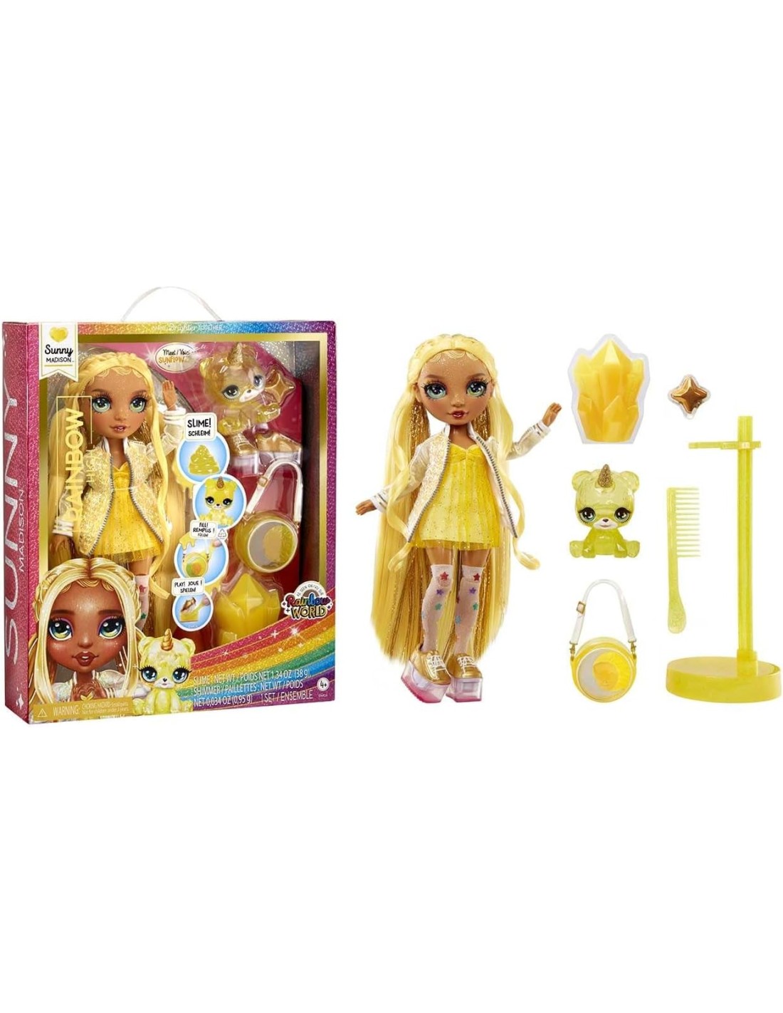 ISPIRA CREATIVITÀ: Scopri e gioca con le tue bambole preferite Rainbow High in straordinari modi magici, ogni bambola è venduta con uno speciale animale da compagnia, abiti personalizzabili e un kit slime scintillante KIT SLIME SCINTILLANTE: Per realizzare il tuo slime scintillante, versa lo slime incolore e le polveri scintillanti nel cristallo, aggiungi un po' d'acqua e agita per ottenere uno slime giallo scintillante. Segui le istruzioni fornite con la bambola ANIMALETTO MAGICO: Per la prima volta in assoluto, Sunny ha un adorabile animaletto magico, un orsetto con un corno; per cambiare il colore dell'orsetto, riempi la testa dell'animaletto con lo slime fai-da-te ACCESSORI FASHION PERSONALIZZABILI: Sunny Madison ha adorabili scarpe e una borsetta che puoi personalizzare, cambiando colore e aggiungendo un po' di slime BRILLA IN GIALLO: Sunny è vestita di GIALLO dalla testa ai piedi e il suo viso brilla di scintille magiche; ha splendidi lineamenti dettagliati, bellissimi capelli gialli con treccine, lunghe ciglia e occhi in vetro FLESSIBILE: Poiché è completamente snodabile, è facile personalizzarla e divertente giocarci. La testa, le braccia, le mani e le gambe si piegano per tante pose divertenti, comprese le spaccate; oppure si può esporre sul supporto per bambole incluso COSA INCLUDE: Bambola da 28 cm con vestito e magiche scintille sul viso, scarpe e borsetta personalizzabili, animaletto magico personalizzabile con corno, kit per slime fai da te con 1 confezione di polvere di slime, shaker scintillante in cristallo CONSIGLIO PRO - LAVA I CAPELLI PER ELIMINARE IL GEL PER LO STYLING: Quando apri la scatola, lava i capelli della bambola per rimuovere il gel e falli asciugare completamente. Ecco, sono pronti per essere spazzolati