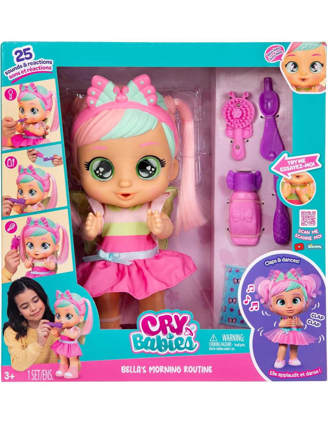Routine del mattino: Bella si prepara per l'asilo Day Care con 3 diverse routine. Interagisce con 3 diversi accessori: spazzolino, pettine e cucchiaio. Inoltre, batte le mani e balla! È dotata di 6 accessori e riproduce 25 suoni e reazioni
