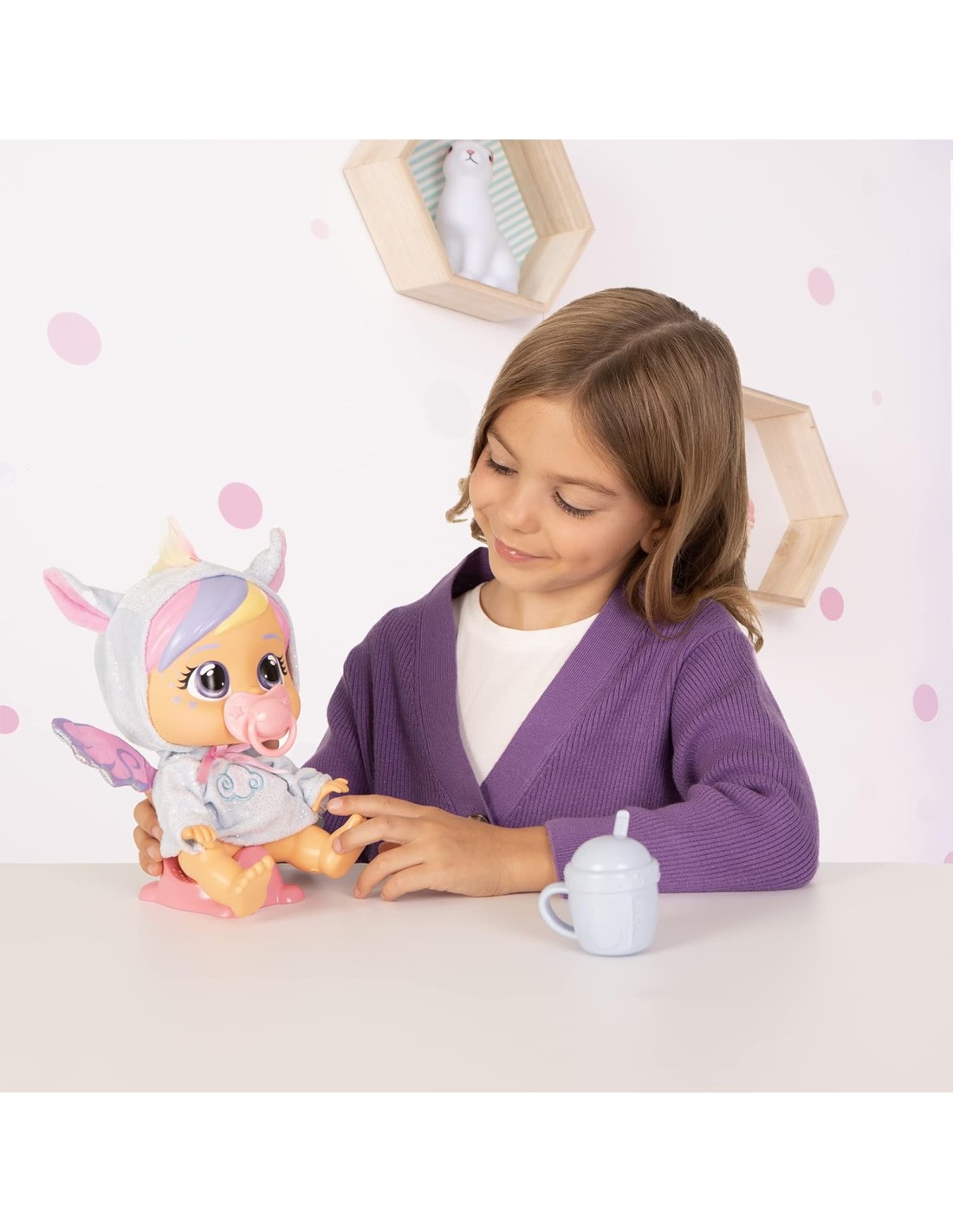 BAMBOLA INTERATTIVA: Loving Care Fantasy Jenna ha i capelli dipinti e gli occhi grandi Piangere davvero: metti l'acqua sulla testa di Jenna e premete per farla piangere, come un vero bambino! PIGIAMA INTERCAMBIABILE: Puoi toglierti il pigiama personalizzato e cambiarlo con una delle altre bambole dei bambini piangenti! 3 ACCESSORI: Viene fornito con un ciuccio, un biberon e un vasino Giocattoli educativi: offrono un modo divertente per sviluppare l'immaginazione dei bambini e aiutarli a esprimere i loro sentimenti