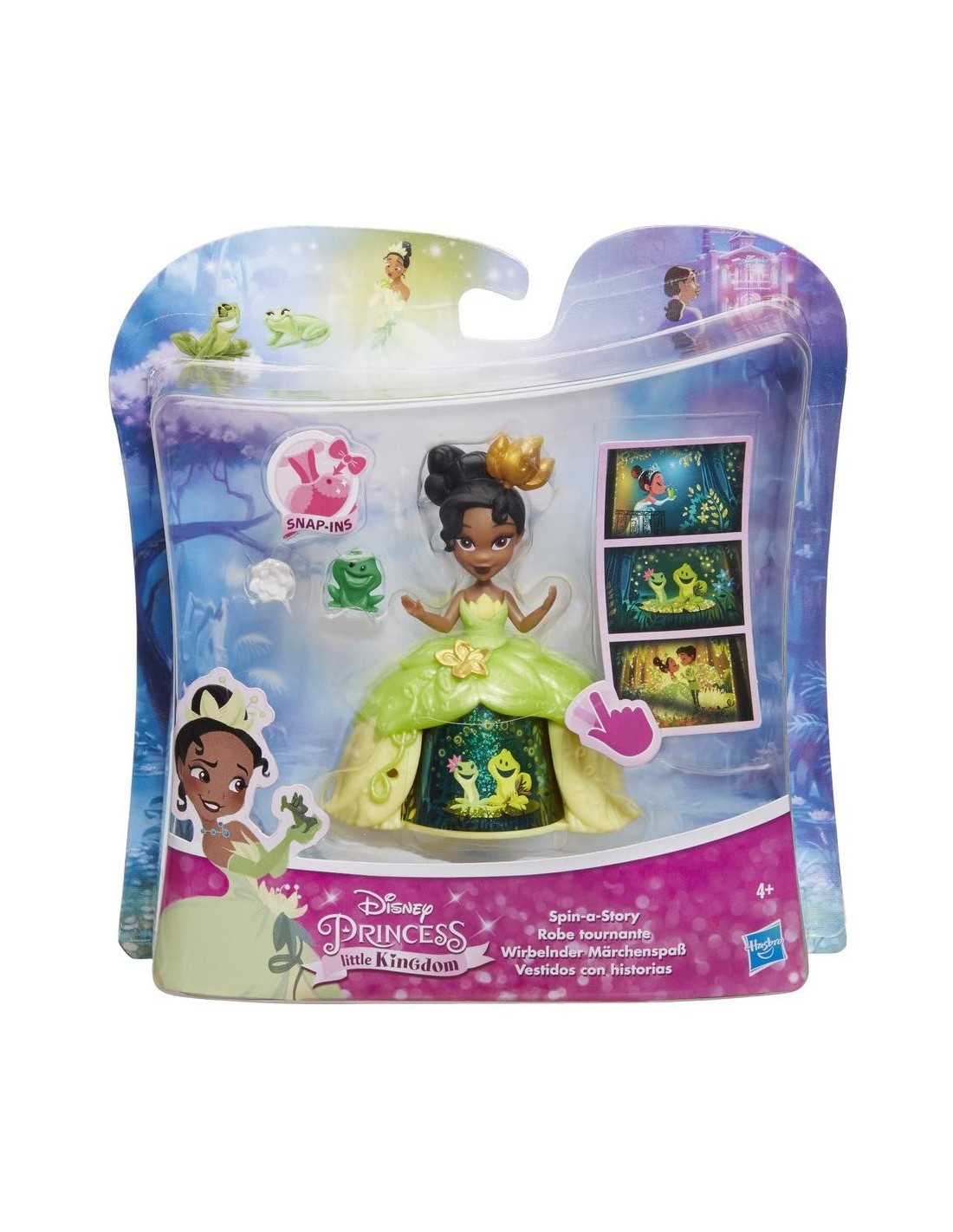 Tiana Le piccole principesse possono giocare con la bellissima principessa Disney Tiana ed il suo magico vestito Arrotola la bambola su una superificie e vedrai scintillare sulla sua gonna 3 momenti indimenticabili del film Le bambine possono divertirsi ricreando l'abbigliamento di Tiana con pezzi aggiuntivi e costruire un piccolo regno con le altre bambole (ciascuna acquistabile separatamente).