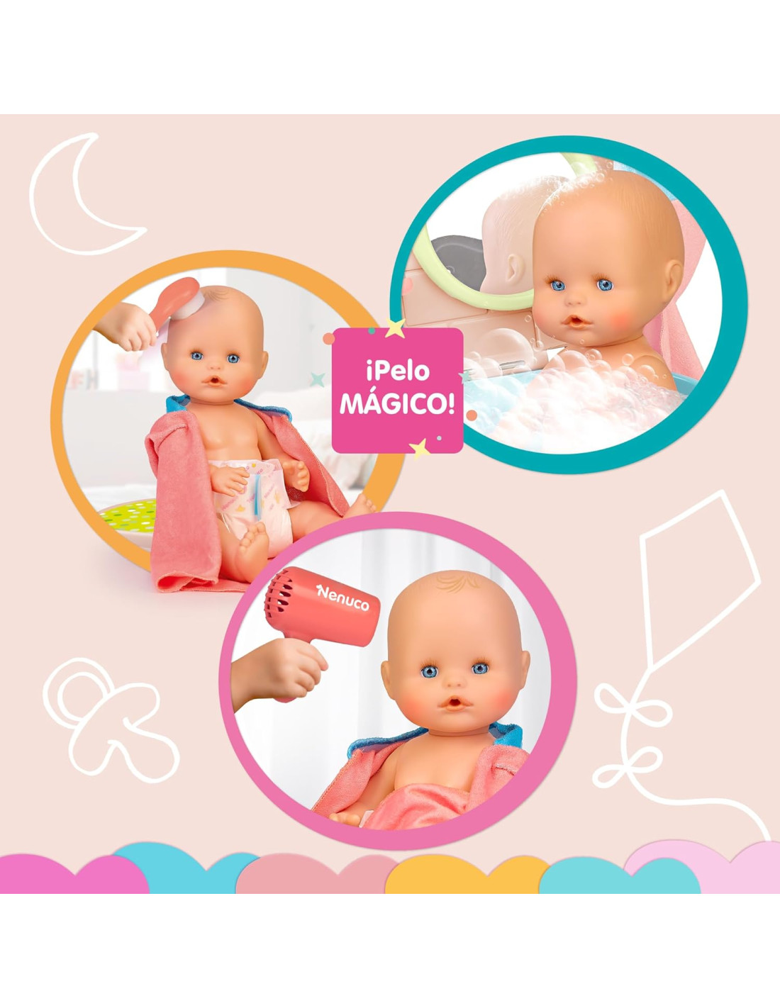 Bambola da 35 cm con corpo rigido, può bere e fare pipì. Passando il pettine bagnato ci sarà un effetto magico….appariranno i capelli!