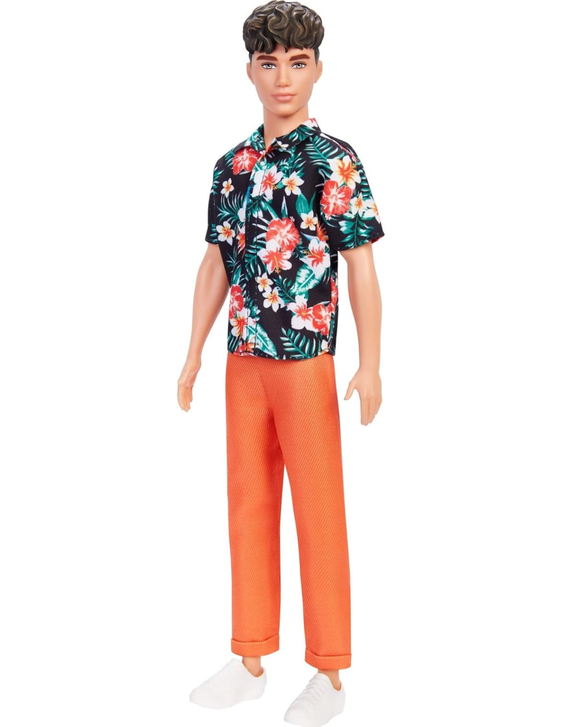 Le bambole Ken Fashionistas sfoggiano un look all'ultima moda e uno stile unico che non passa mai inosservato. La bambola Ken indossa una camicia hawaiiana floreale e un paio di pantaloni arancioni con risvolto. Le scarpe da vela bianche aggiungono il tocco finale per un moderno look tropicale. La bambola Ken ha i capelli castani rasati sui lati. Riponi la bambola o altri abiti e accessori Barbie nella confezione in vinile riutilizzabile, dotata di cerniera, che puoi personalizzare con le decorazioni che preferisci, come degli adesivi. Non ci sono limiti alla fantasia: personalizzala, riempila e portala sempre con te! INFINITE POSSIBILITÀ DI DIVERTIMENTO con la bambola Ken a tema Hawaii. L'outfit alla moda, con camicia a fiori tropicali e pantaloni arancioni con risvolto, è completato dai corti capelli scuri IL LOOK ESTIVO in stile nautico è completato dalle scarpe da barca bianche, che calzano perfettamente ai piedi sagomati con caviglie snodate di Ken.