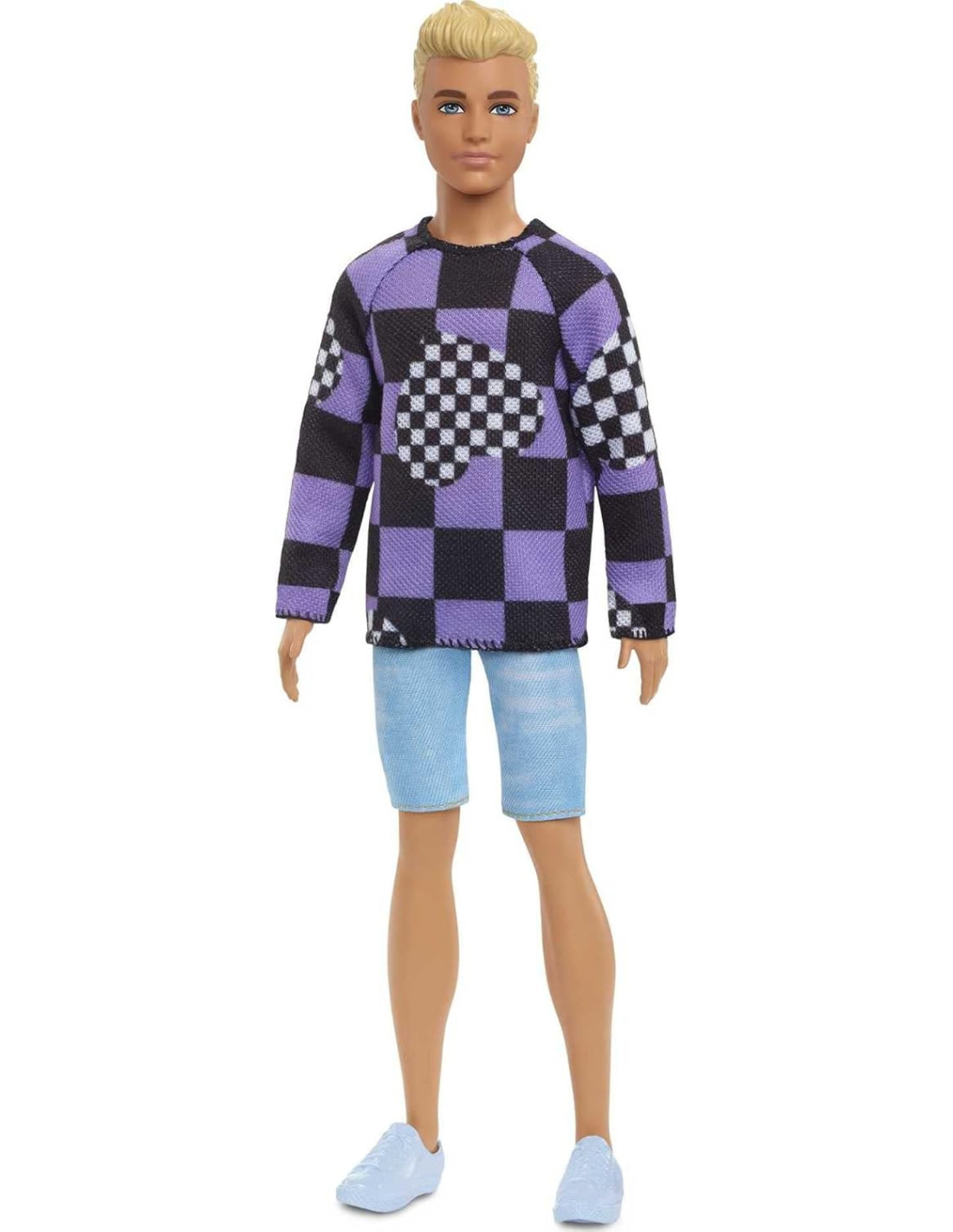 Le bambole Ken Fashionistas sono davvero irresistibili con i loro look unici e alla moda La bambola Ken ha un fisico originale e indossa un maglione a quadri viola e neri con un cuore a scacchi abbinato a un paio di pantaloncini di jeans Le sneaker bianche sono il tocco finale per un look all'ultimo grido Ken ha i capelli biondi corti scolpiti