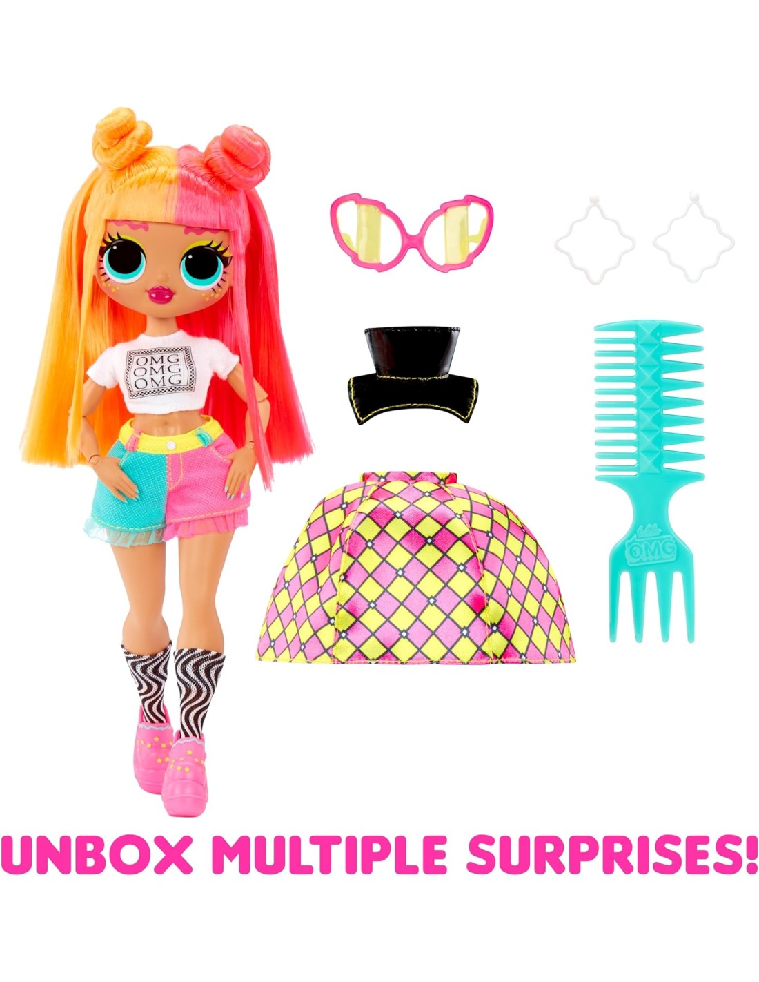 BENTORNATE Le bambole alla moda LOL Surprise OMG più amate dai fan sono tornate in una veste glamour e con bellissime acconciature: saluta Neonlicious, la sorella maggiore del personaggio elettrico Neon Q.T. CARATTERISTICHE MOZZAFIATO: Questa riedizione di Neonlicious mette in mostra le sue splendide caratteristiche, l'acconciatura, l'outfit strepitoso ed è snodata per un'infinità di pose PRONTA PER SFILARE Vesti Neonlicious con la sua maglietta OMG unica, il corsetto alla moda e la meravigliosa gonna a scacchi ABITI CHE CAMBIANO: Scopri la sorpresa aggiuntiva con gli abiti di Neonlicious e trasforma istantaneamente il suo abbigliamento togliendo la gonna per rivelare i pantaloncini bicolore che creano un look completamente diverso SCOPRI PIÙ SORPRESE: Tra cui una bambola fashion OMG, abiti audaci, occhiali da sole alla moda, orecchini a cerchio, scarpe e un pettine per capelli GIOCA CON TUTTO IL GRUPPO: Colleziona tutte le 4 bambole alla moda LOL Surprise OMG, le più amate dai fan: Swag, Neonlicious, Lady Diva e Royal Bee