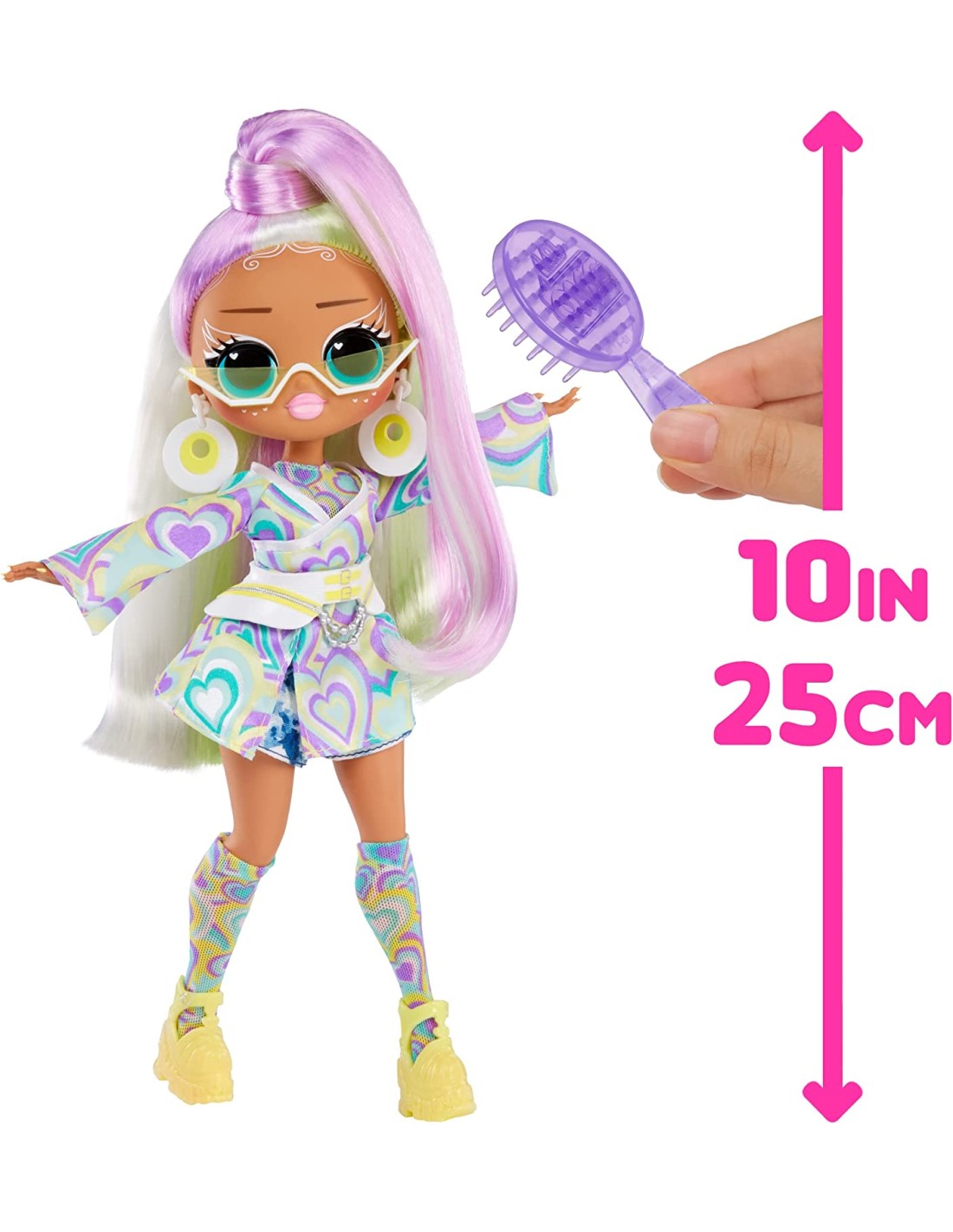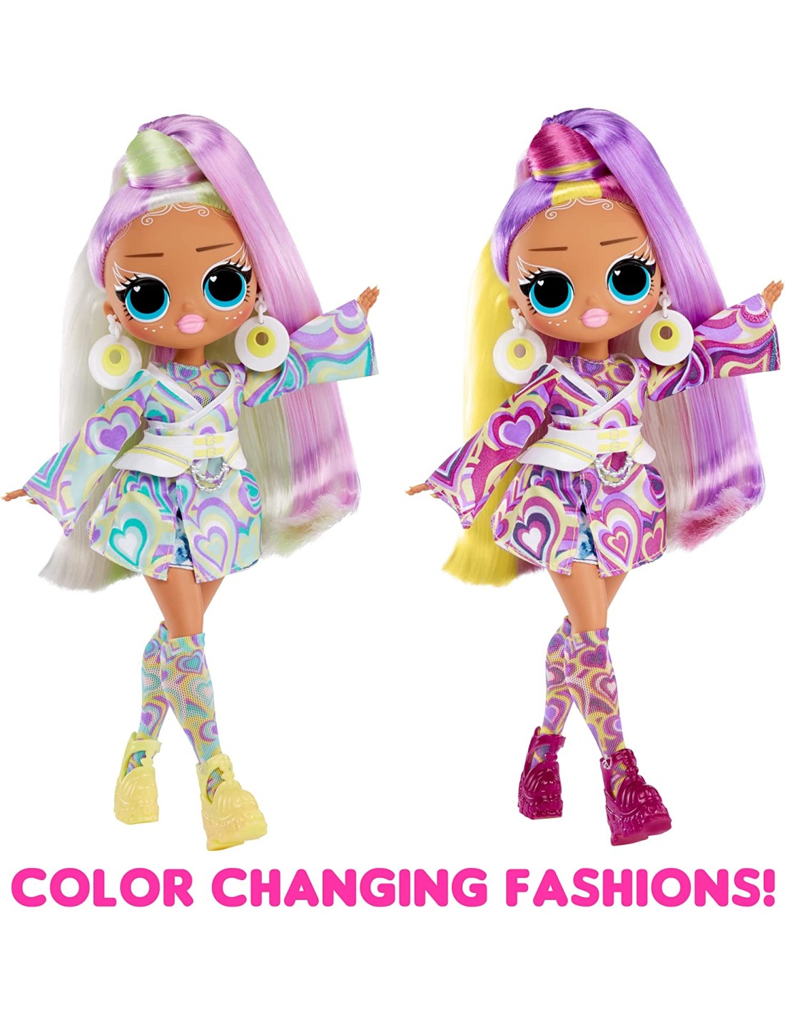 TI PRESENTIAMO SUNRISE. Ecco Sunrise, la fashion doll LOL Surprise OMG Sunshine Makeover! Ama modificare i propri look ed essere fonte di ispirazione per tutti con i suoi continui tagli e outfit diversi e alla moda SORPRESE CAMBIACOLORE. Gioca con Sunrise all'aperto in qualsiasi momento della giornata, con il sole o la pioggia, oppure al chiuso vicino a una finestra, e assisti a un'affascinante trasformazione. Guarda come i capelli e l'outfit cambiano colore! TANTISSIME SORPRESE. Include una fashion doll OMG Sunshine Makeover, outfit audaci, scarpe, calzini lunghi, accessori, occhiali squadrati, orecchini, cintura con stringhe, una spazzola e un supporto per bambole TRASFORMAZIONI INFINITE. Puoi farle cambiare colore quante volte vuoi! Al chiuso Sunrise torna al suo aspetto originale, mentre all'esterno o vicino a una finestra, puoi ammirare di nuovo questa incredibile trasformazione PRONTA PER SFILARE. Per Sunrise scegli un outfit bohémien: kimono elegante, calzettoni alla moda e short trendy! Ha lineamenti e capelli bellissimi ed è snodabile per assumere molte pose. Suggerimento: rimuovi le mani per vestirla più facilmente CAPELLI BUFFI E LOOK ALLA MODA. L'elegante kimono e i lunghi calzini di Sunrise nascondono dettagli decorativi che si rivelano solo se esposti alla luce, quando anche le scarpe chic da gialle diventano rosa GIOCA CON TUTTA LA CREW. Colleziona tutte le 3 fashion doll LOL Surprise OMG Sunshine Makeover: Bubblegum DJ, Sunrise e Switches!