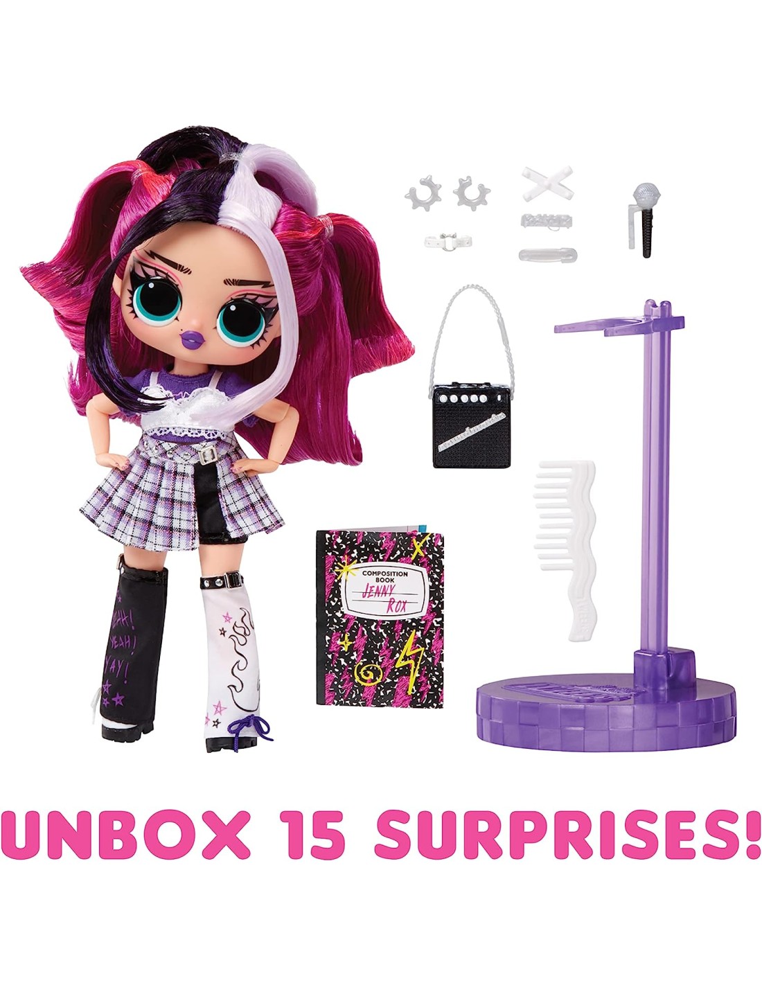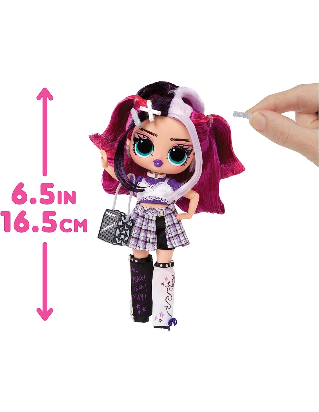 SCOPRI 15 SORPRESE. Include una fashion doll Tweens da 16,5 cm, outfit audaci, scarpe, accessori, fermagli per capelli, orecchini, una collana, una borsa, un microfono, una spazzola e un supporto per bambole