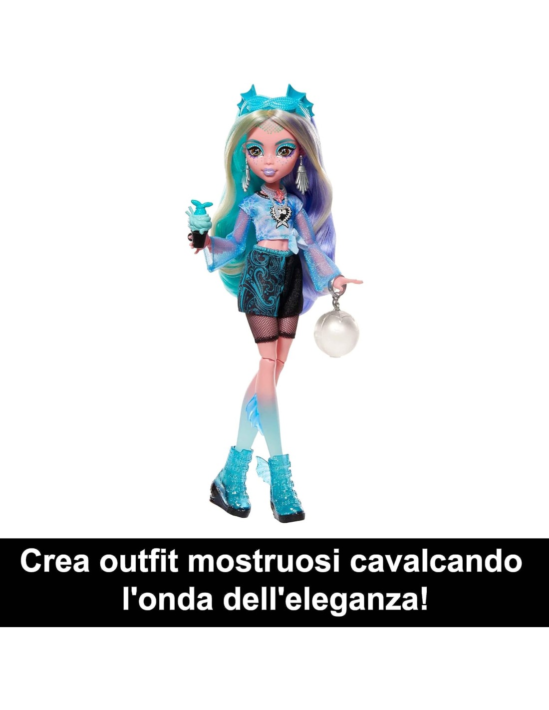 La bambola Lagoona Blue e le sue sorprese alla moda risplendono grazie ai dettagli glamour e perlacei da urlo in questa edizione Colori Mostruosi di Segreti da Brivido! Apri il suo armadietto per trovare accessori marini. Sai tenere un segreto da brivido? Prendi le quattro chiavi e lava via tutto il rivestimento nero per una sorpresa Color Reveal, quindi sblocca tutti e quattro gli scomparti corrispondenti per scoprire gli oggetti nascosti all'interno. Una volta aperta la confezione, usa l'armadietto a forma di bara per raccontare storie da urlo e per conservare la bambola Lagoona Blue e tutti i suoi abiti e accessori. Lagoona Blue ha soffici capelli colorati e labbra color pastello. I suoi abiti tremendamente chic riflettono le sue origini da mostriciattola acquatica e incoraggiano la creazione di stili e abbinamenti! Segreti da Brivido include tantissimi accessori, da una stola in pelo e una collana esclusiva a una borsetta e gli snack, per stimolare l'immaginazione e l'espressione dello stile. Combinali per creare oltre 125 look! Scopri le altre bambole e i set di Monster High per ottime idee regalo, abiti spaventosamente belli e divertenti giochi con gli amici mostri. Altri playset e bambole in vendita separatamente, secondo disponibilità.