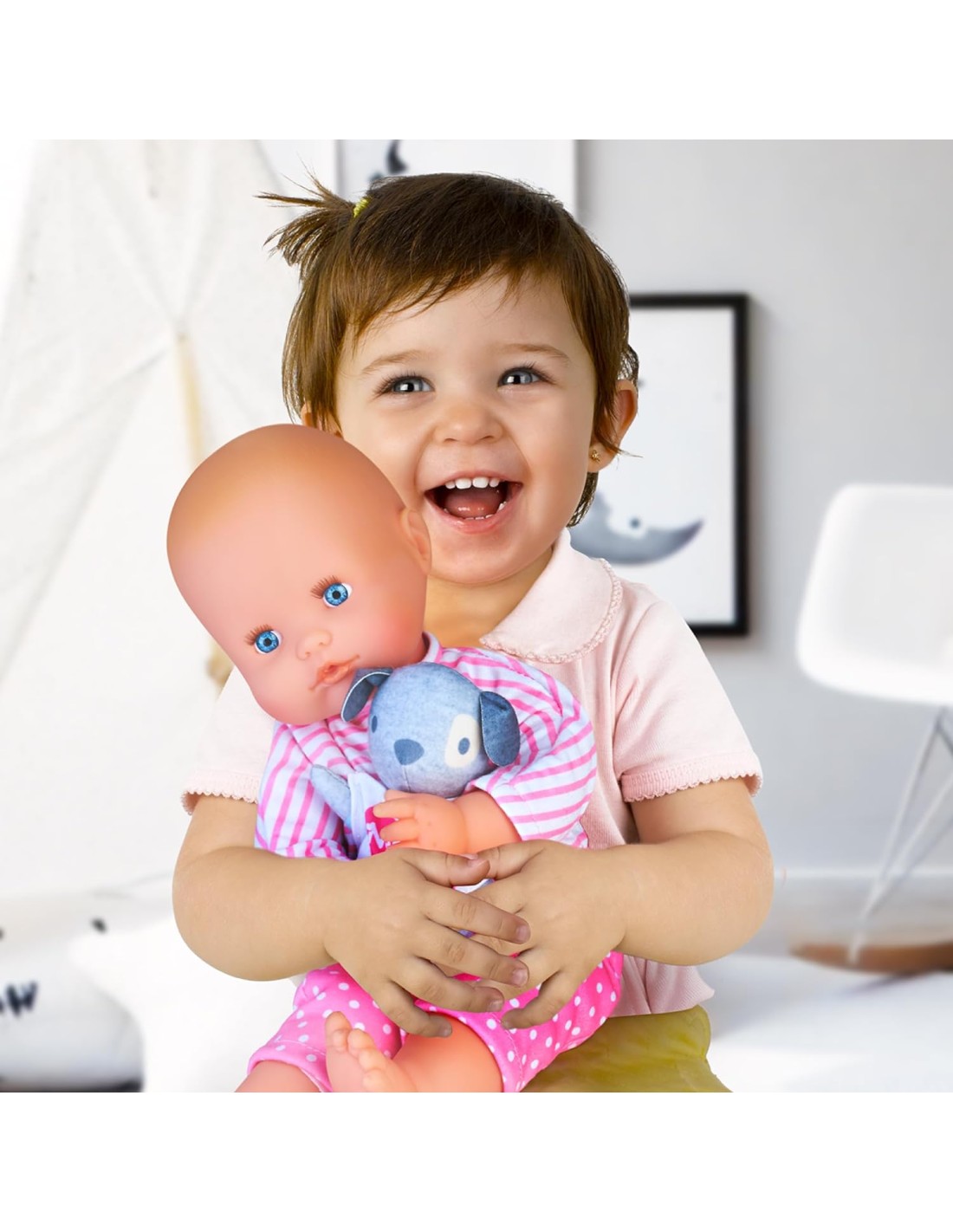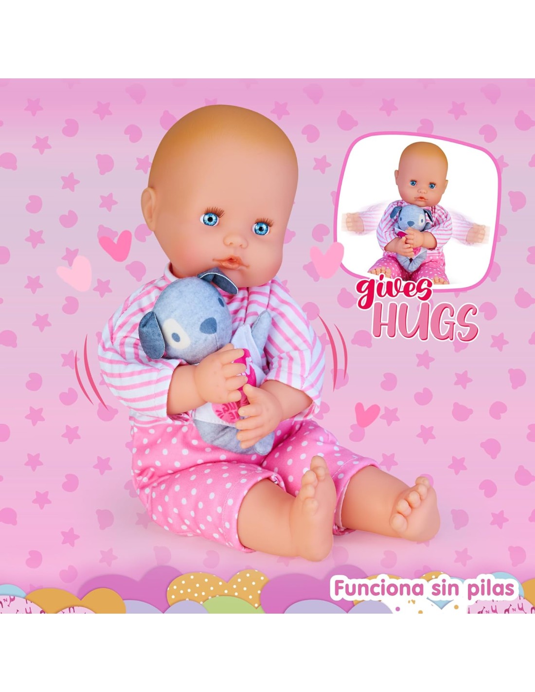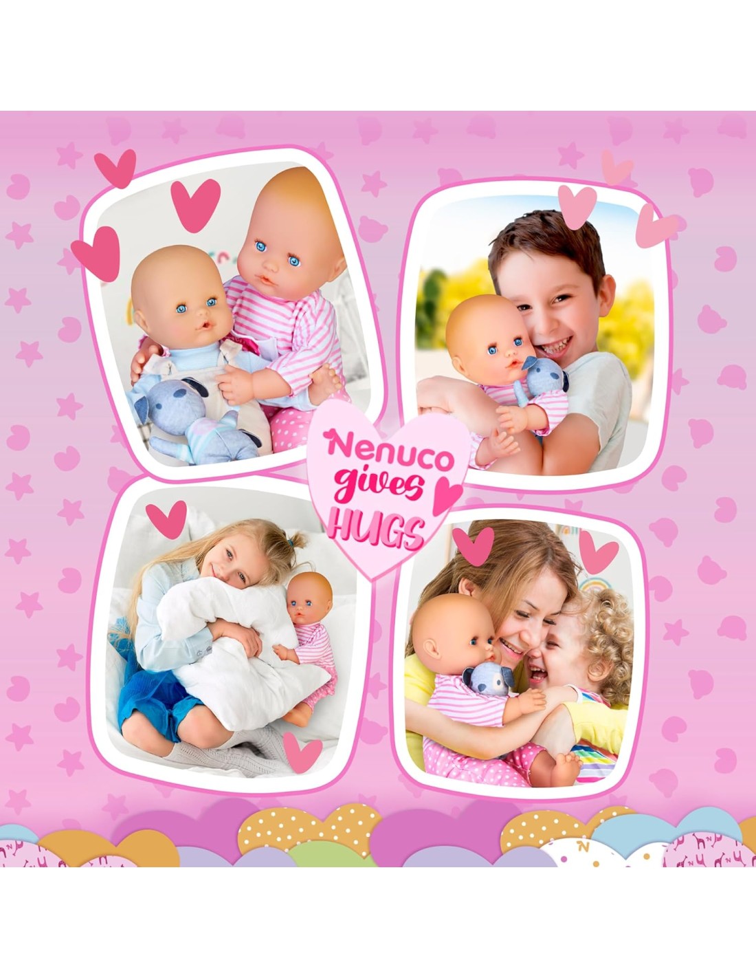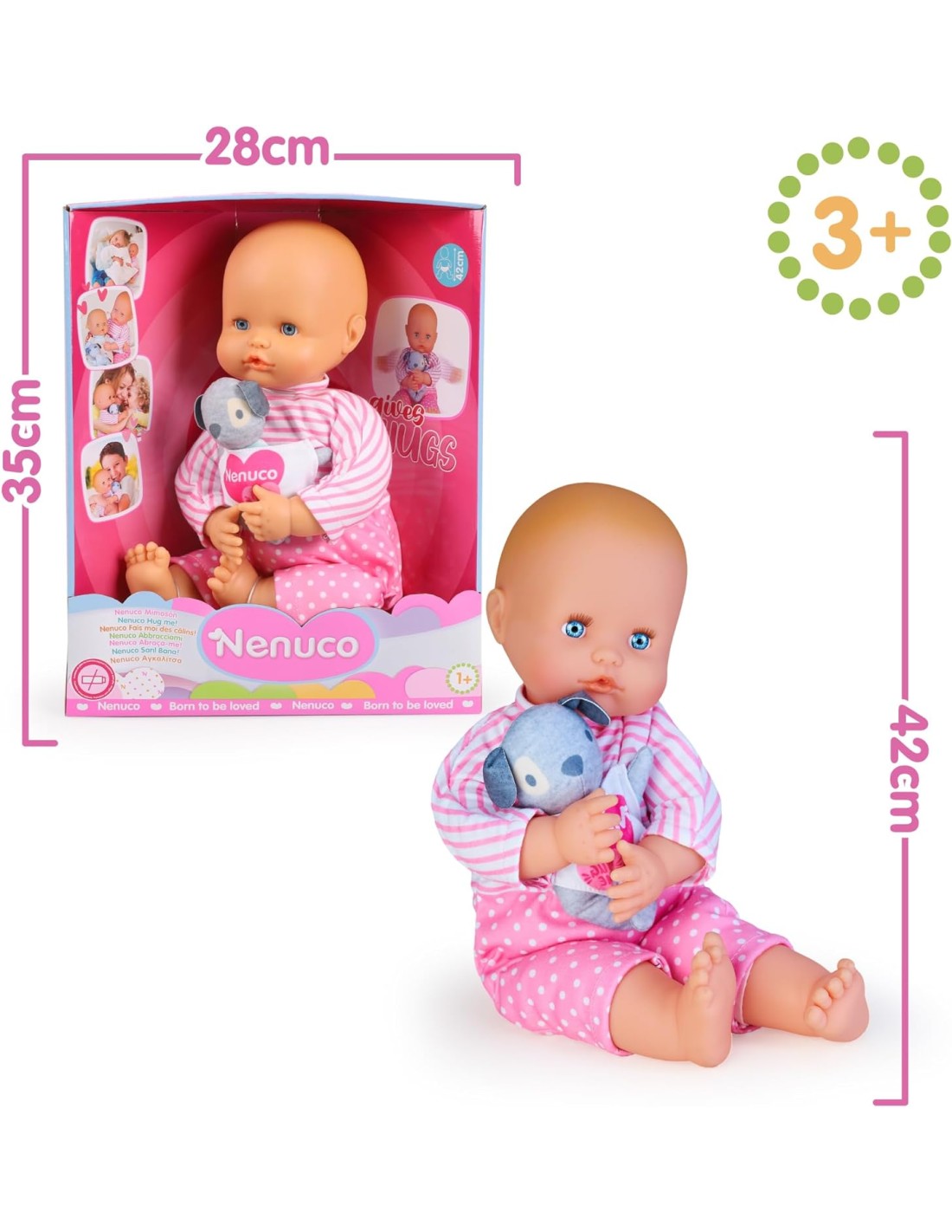 Nenuco Abbracciami è un adorabile bambola da 42 cm con un corpo morbido. Le braccia e le gambe articolate consentono di abbracciare come se fosse un vero bambino, fornendo un'esperienza di gioco realistica; E' incluso anche un simpatico cucciolo morbido in stoffa. Il cagnolino è il compagno perfetto per Nenuco, e insieme formano un duo inseparabile. I bambini possono ricreare scene di gioco amorevoli e divertenti con Nenuco e il suo fedele amico peloso. I bambini possono sviluppare la loro immaginazione e creatività, inventando storie diverse per il loro bambino e il loro animale domestico; La bambola indossa un bel pigiamino rosa e bianco rimovibile, che aggiunge un tocco di tenerezza e dolcezza al look. Per bambine e bambini da 1 anno;