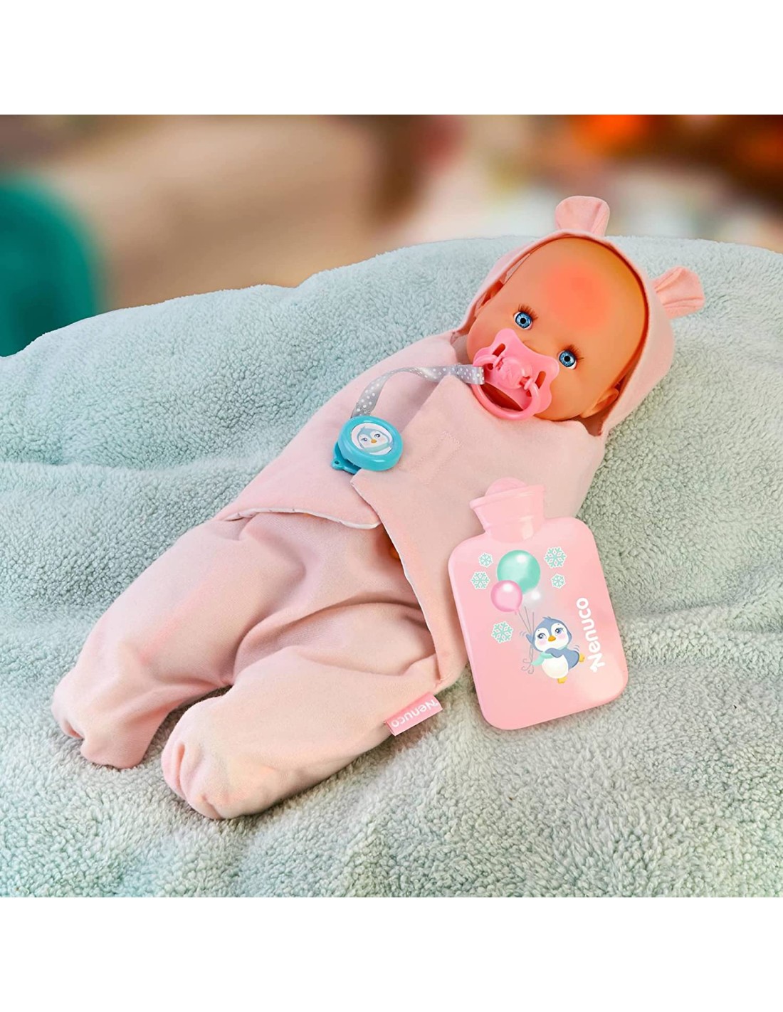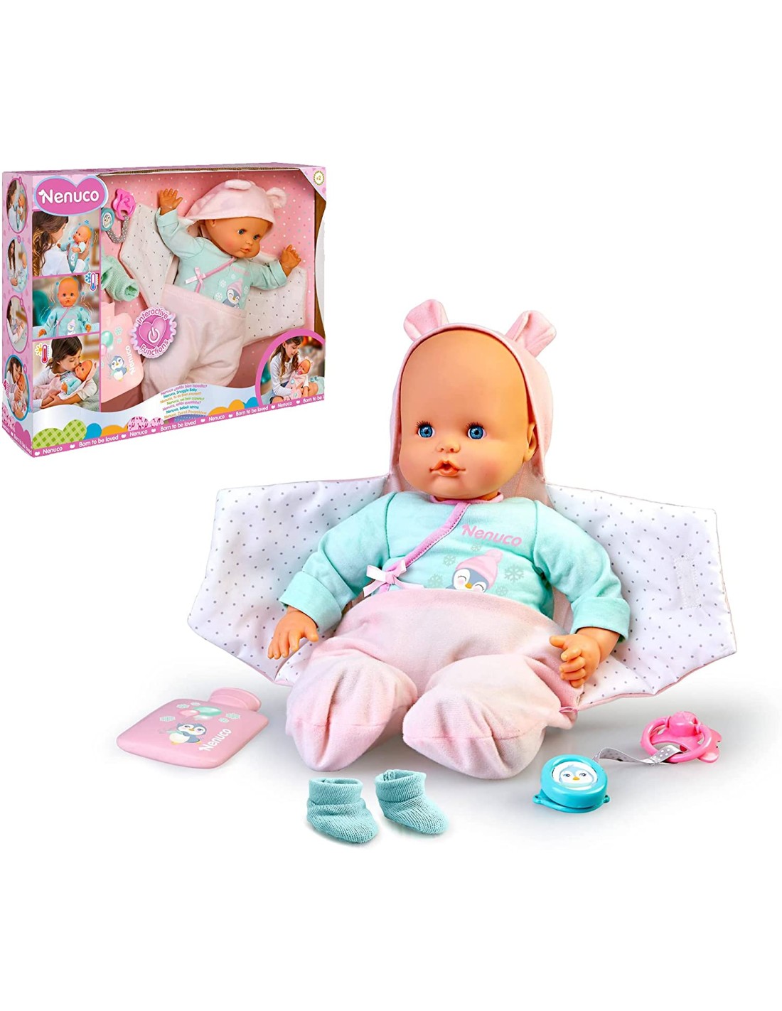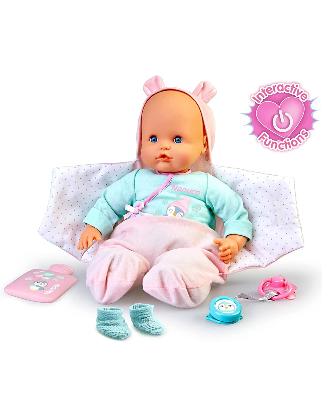 Bambola Nenuco da 42 centimetri dal corpo morbido, elettronica. Indossa un pigiama di stoffa azzurro con un simpatico pinguino, non intercambiabile con altri vestiti; Include vari accessori come un ciuccio con clip per attacarlo ai suoi vestiti, delle calzine azzurre e una borsa dell' acqua giocattolo, oltre alla coperta rosa con orecchie; Se Nenuco ha freddo inizierà a tremare..e dovrai coprirlo con la sua coperta rosa, mettergli la borsa dell'acqua calda.....e se la fronte diventa rossa significa che ha molto caldo e dovrai cercare di abbassare la temperatura scoprendolo. I bambini potranno giocare tutte le volte che vorranno. Un giocattolo consigliato per bambine/i a cui piacciono le bambole, dai 2 anni in su; Indicato per incoraggiare giochi di ruolo e di imitazione. Aiuta lo sviluppo affettivo ed emotivo e incoraggia la manualità, le capacità motorie e la coordinazione.